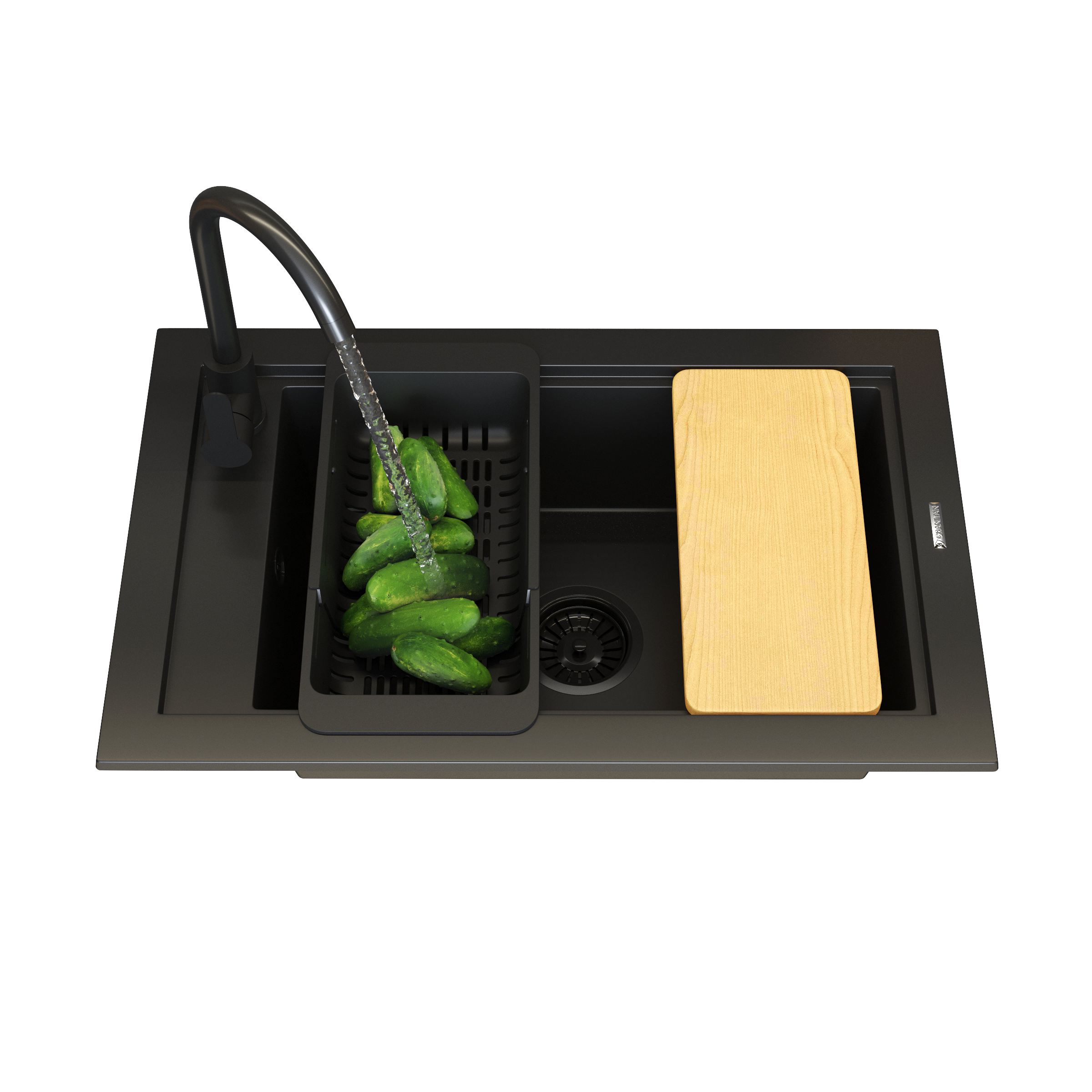 PANAMA este o chiuvetă din granit care îmbină durabilitatea și eleganța, datorită utilizării unui agregat de granit de înaltă calitate și a unei rășini dedicate. Accesoriile suplimentare, precum bateria de bucătărie neagră, uscătorul telescopic, siphonul montat la perete în culoare neagră, precum și insertul din lemn dedicat o fac a fi o alegere extrem de funcțională și estetică pentru orice bucătărie. Impregnantul GraniProtect oferă protecție suplimentară chiuvetei, prelungindu-i durata de viață și menținându-i aspectul impecabil.