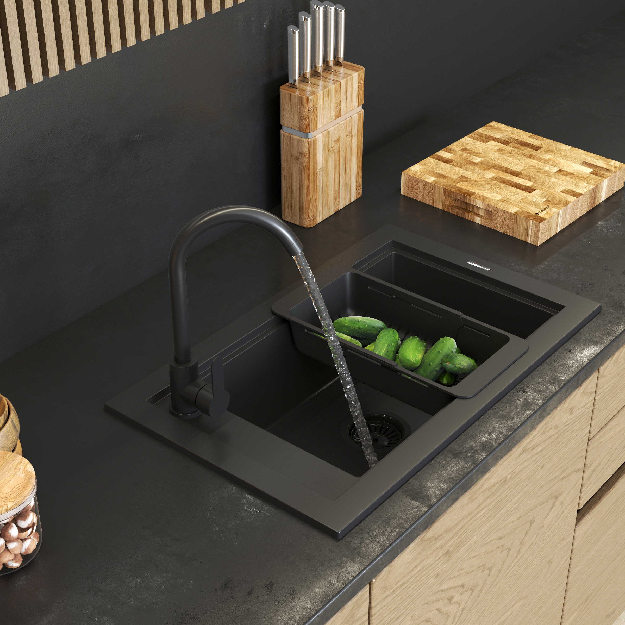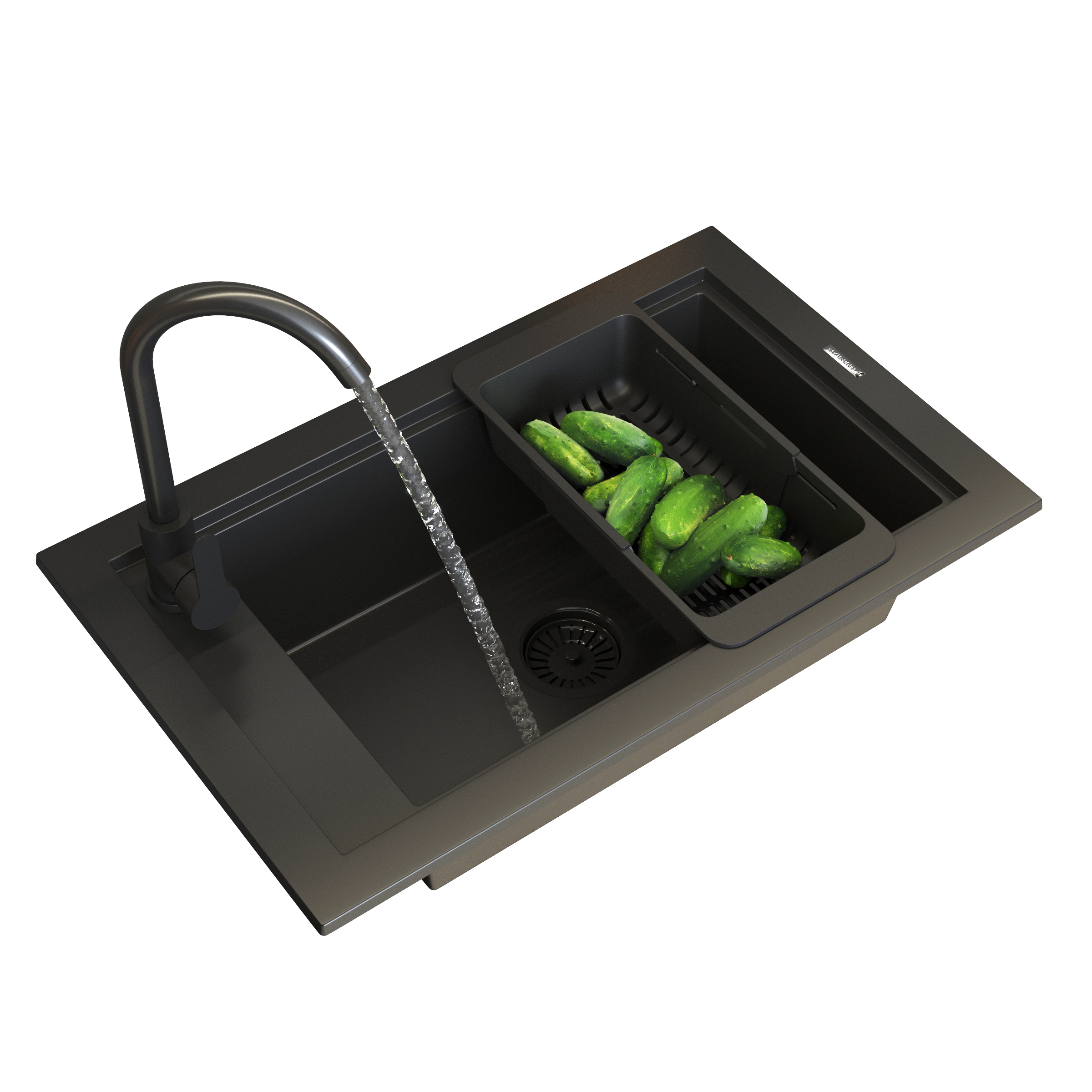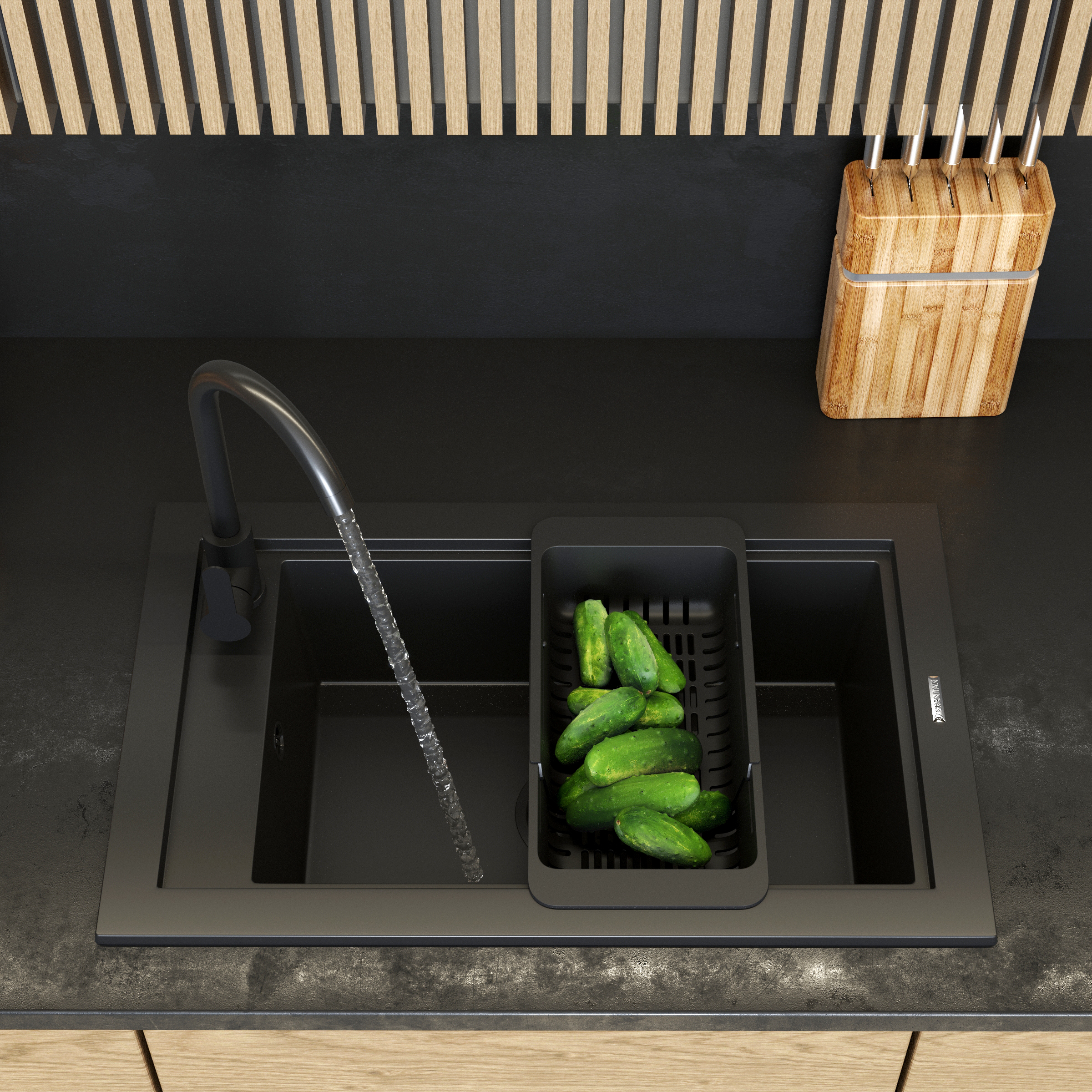 PANAMA este o chiuvetă din granit care îmbină durabilitatea și eleganța, datorită utilizării unui agregat de granit de înaltă calitate și a unei rășini dedicate. Accesoriile suplimentare, precum bateria de bucătărie neagră, uscătorul telescopic, siphonul montat la perete în culoare neagră, precum și insertul din lemn dedicat o fac a fi o alegere extrem de funcțională și estetică pentru orice bucătărie. Impregnantul GraniProtect oferă protecție suplimentară chiuvetei, prelungindu-i durata de viață și menținându-i aspectul impecabil.
