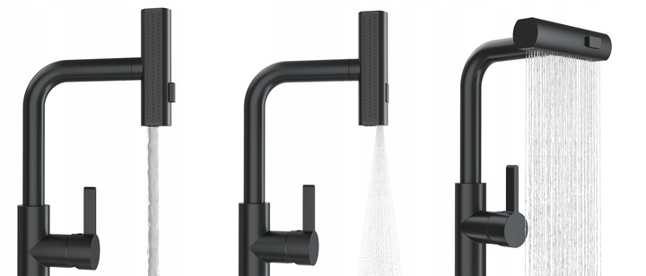 Bateria este echipată cu o pipă extensibilă și rotativă, a cărei poziționare depinde de modul de apă ales. Modelul dispune de un duș cu 3 funcții, care poate emite, în funcție de nevoi, un jet standard, un jet larg de tip duș sau o ceață ușoară.