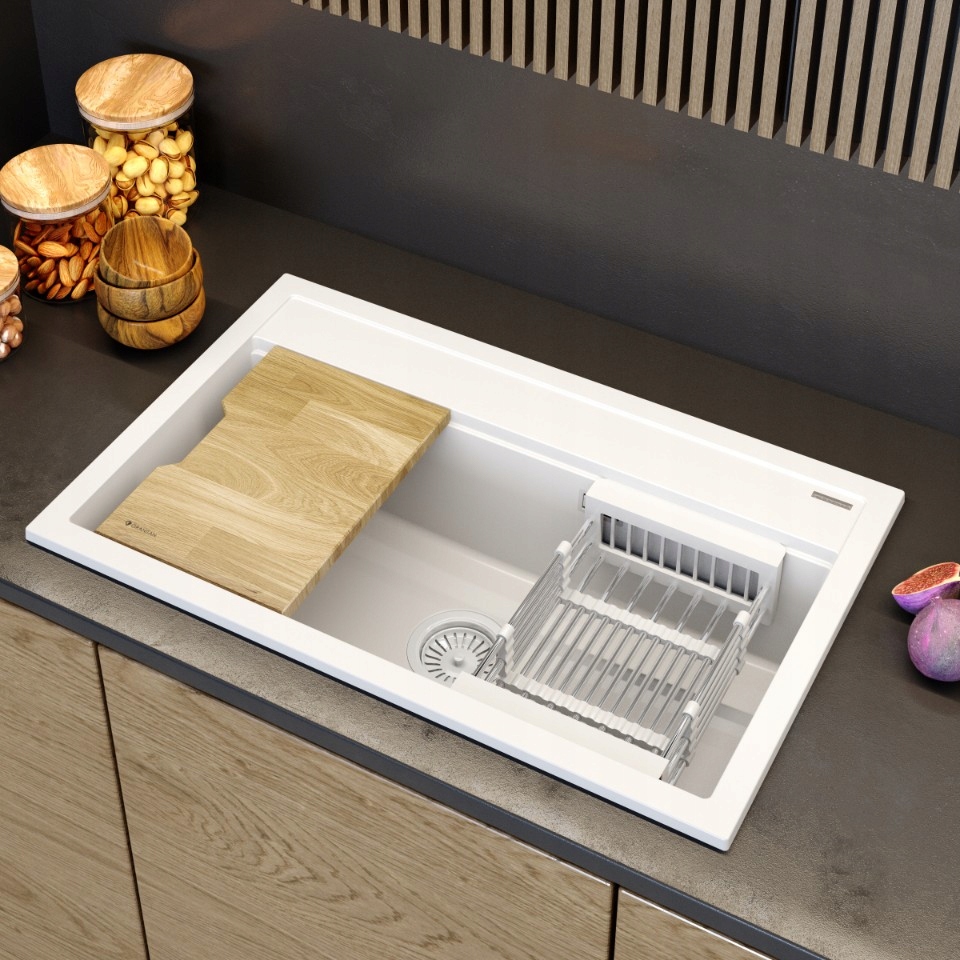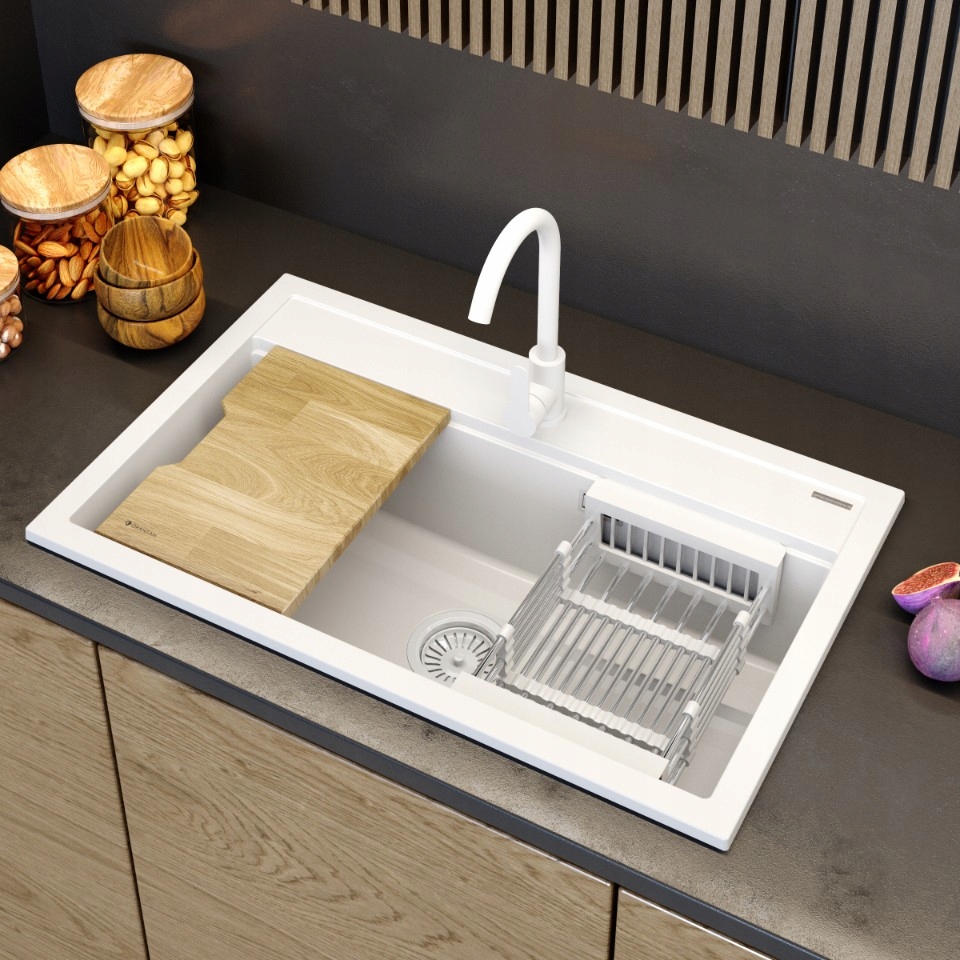 ASTI este o chiuvetă de granit modernă cu o singură cameră, a cărei formă minimalistă este completată de un sifon cu preaplin dreptunghiular.