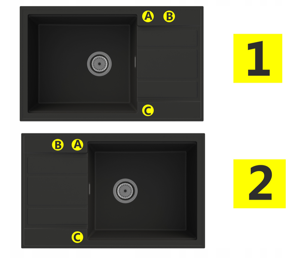 Locațiile în care pot fi realizate găurile sunt marcate pe schița: A, B, C. Există, de asemenea, opțiunea de a comanda chiuveta fără găuri pre-efectuate.