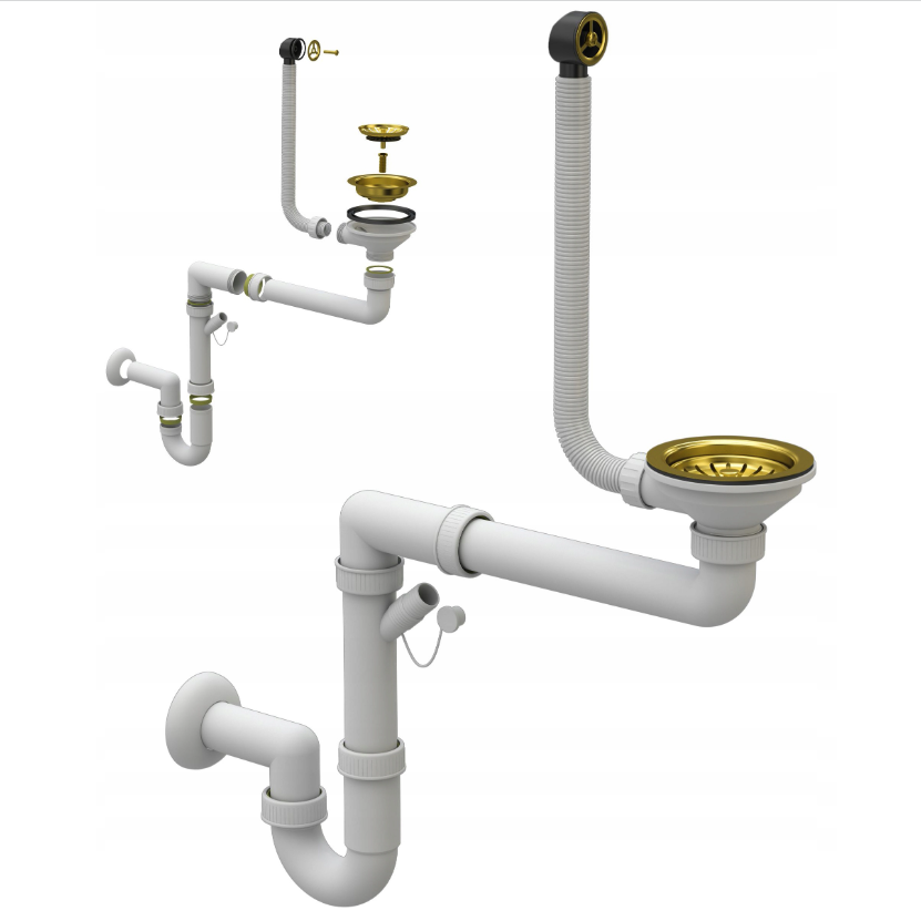 Chiuveta este echipată cu un sifon manual auriu montat pe perete, cu posibilitatea conectării la mașina de spălat vase sau mașina de spălat rufe.