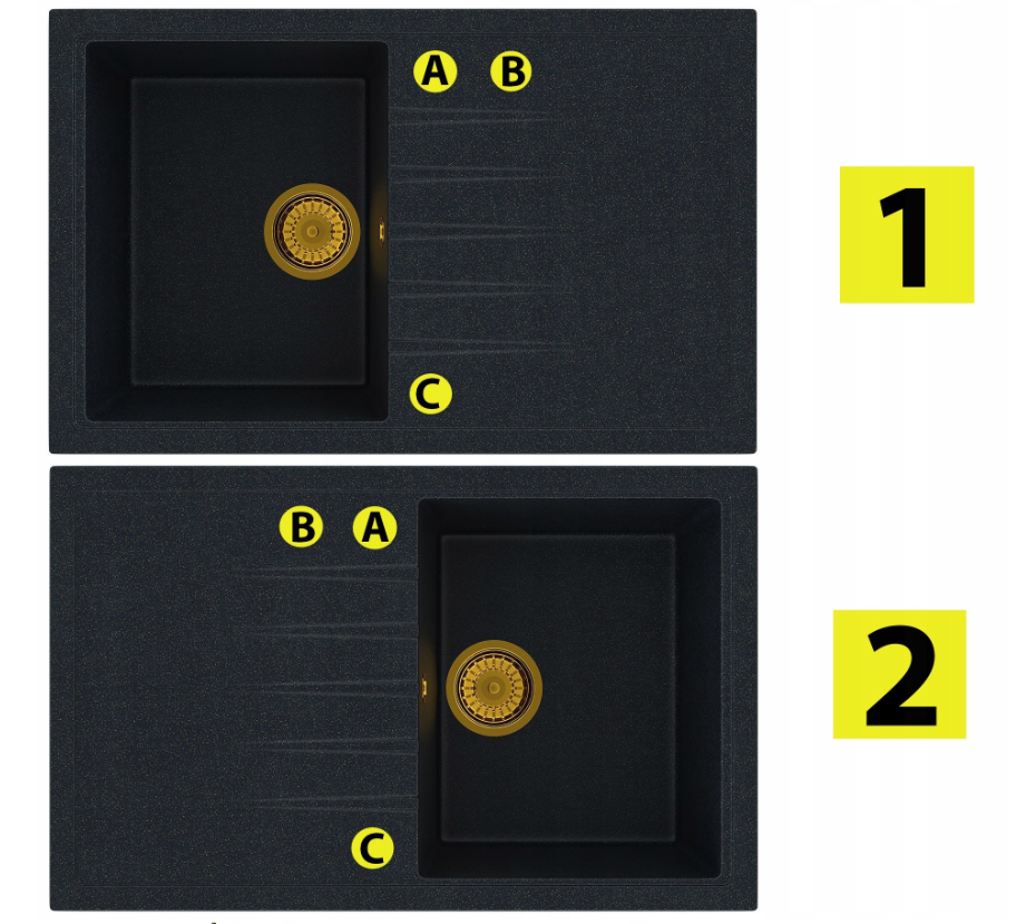 Locurile unde pot fi realizate găuri sunt marcate în desen: A, B, C. Există și opțiunea de achiziționare a chiuvetei fără găuri perforate.