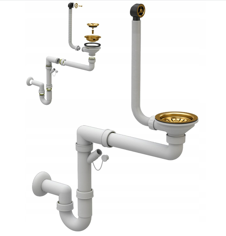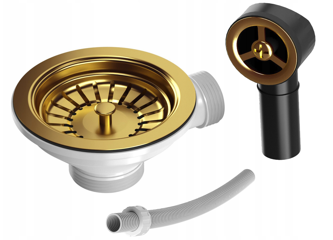 Chiuveta este echipată cu un sifon auriu de perete manual cu posibilitatea de conectare la mașina de spălat vase sau mașina de spălat rufe.