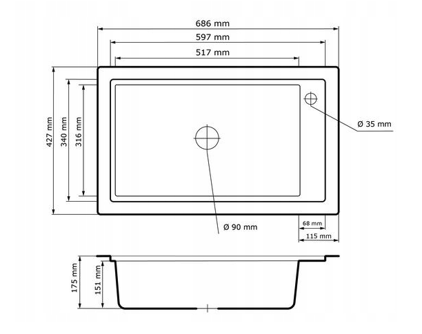 • adâncimea cuvei: 175 mm
