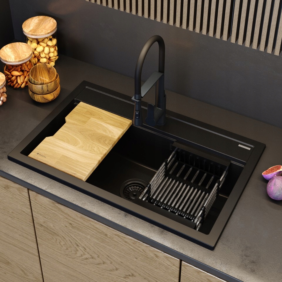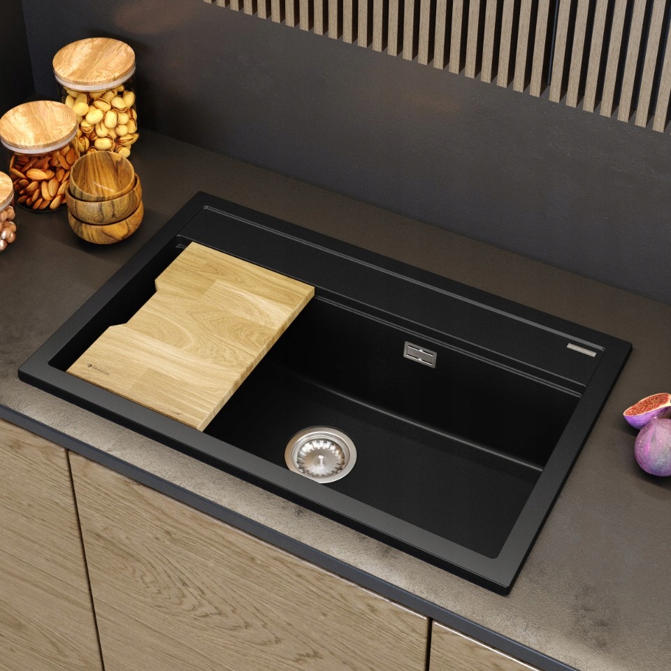CHIUVETĂ GRANIT NEAGRĂ MARE PLATOU DIN LEMN SCURGĂTOR SIFON SET ASTI
