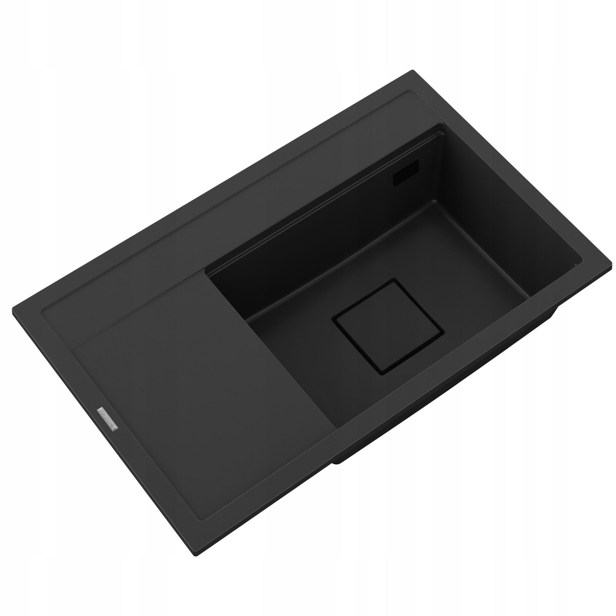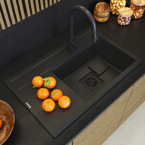 Rendo este o chiuvetă modernă din granit cu scurgător, completată de o capac design pentru evacuare.