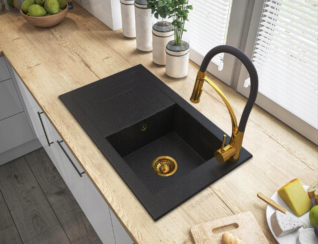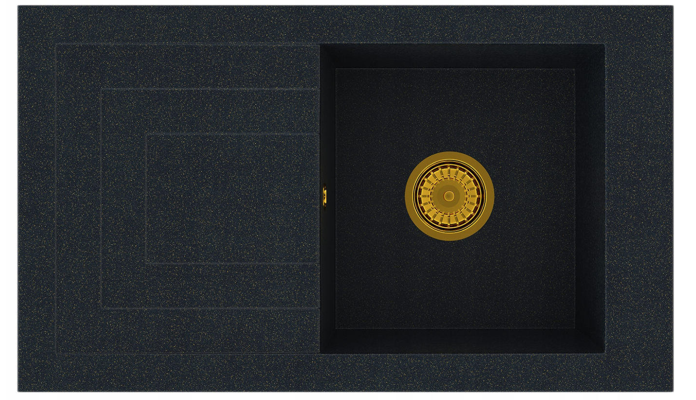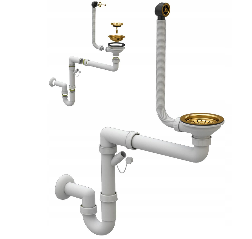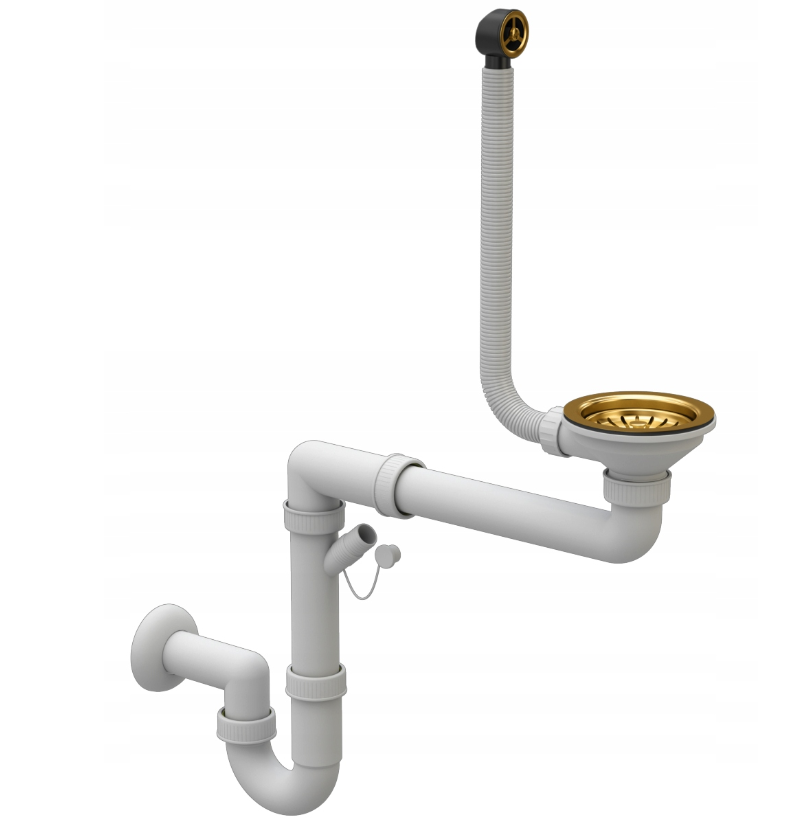 Chiuveta este echipată cu un sifon auriu de perete manual, cu posibilitatea de conectare a unei mașini de spălat vase sau rufe.