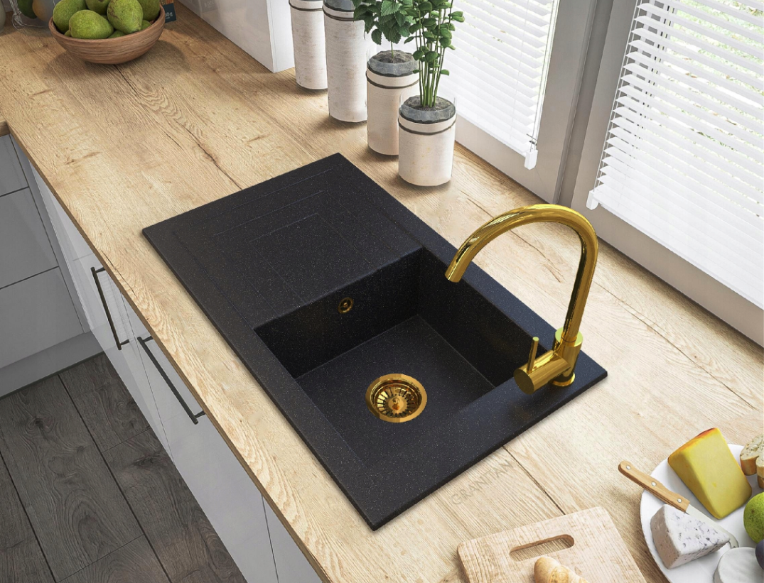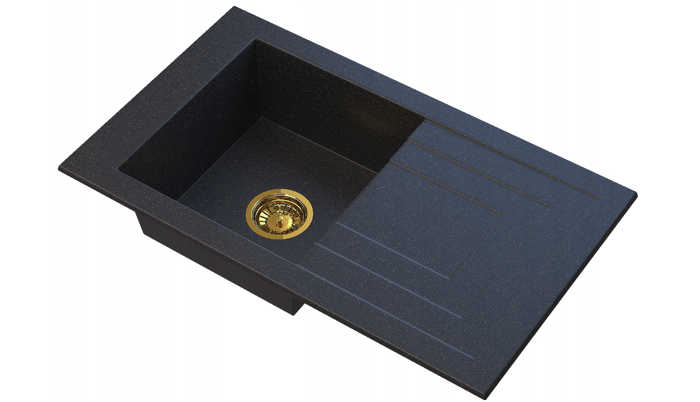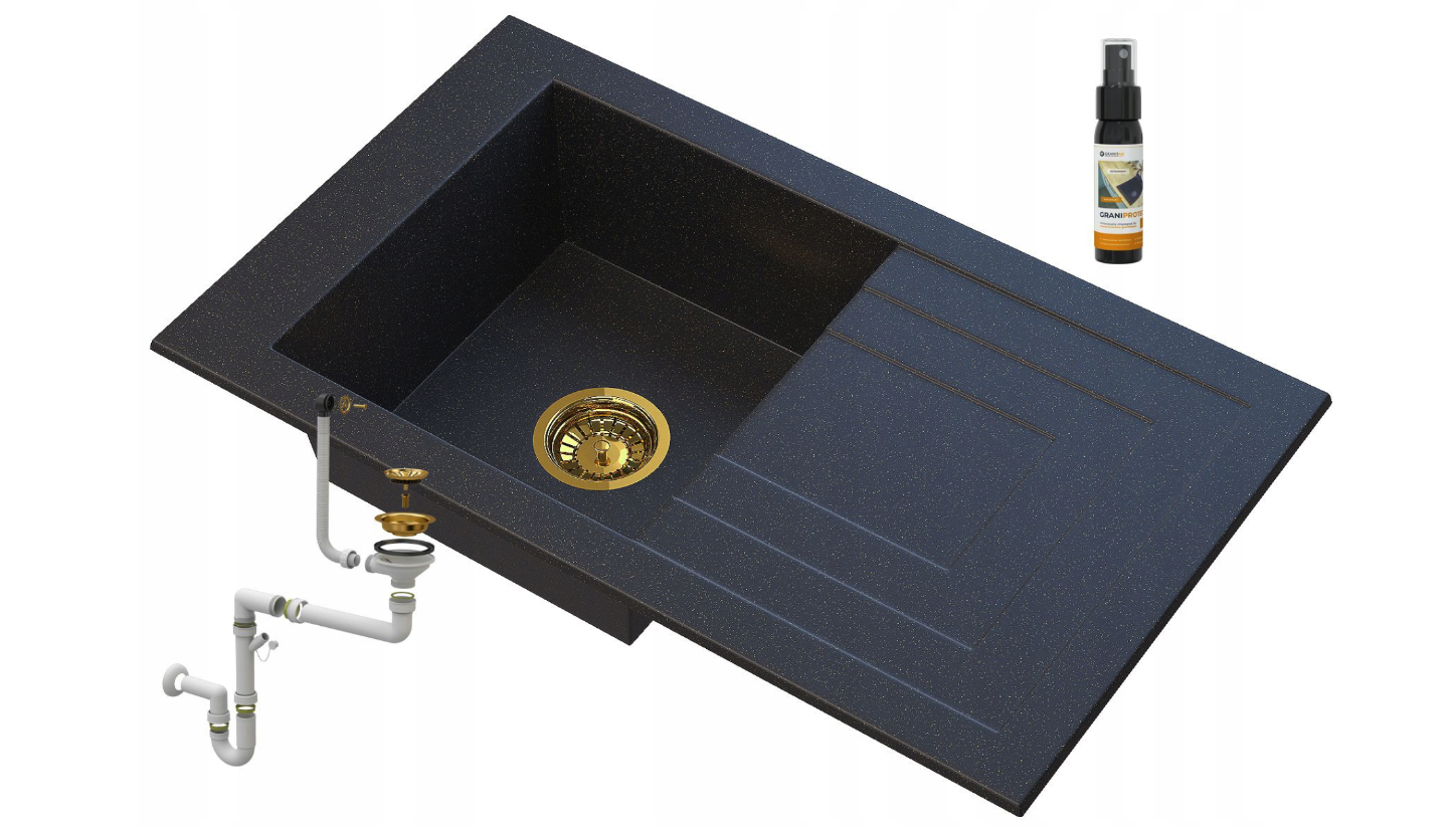 Chiuveta este echipată cu un sifon auriu de perete manual, cu posibilitatea de conectare a unei mașini de spălat vase sau rufe.