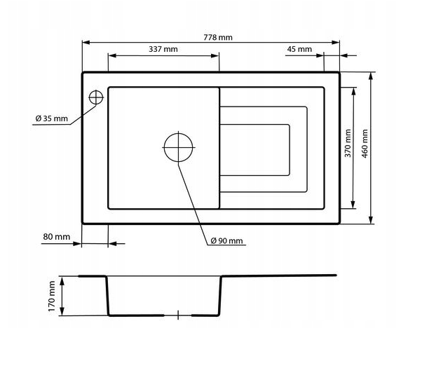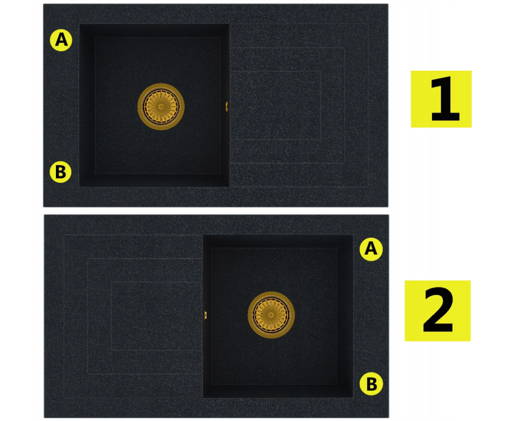 Locurile unde pot fi realizate orificii sunt marcate pe desen: A, B, C. Există și opțiunea achiziționării chiuvetei fără orificii pre-găurite.