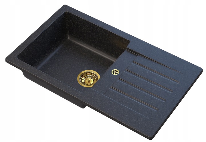 Chiuveta este echipată cu un sifon manual de perete auriu cu posibilitatea de conectare a mașinii de spălat vase sau a mașinii de spălat rufe.