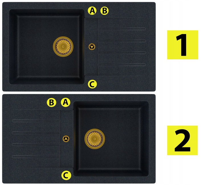 Locurile unde pot fi realizate orificii sunt marcate pe schiță: A, B, C. De asemenea, există opțiunea de a achiziționa chiuveta fără orificii făcute.