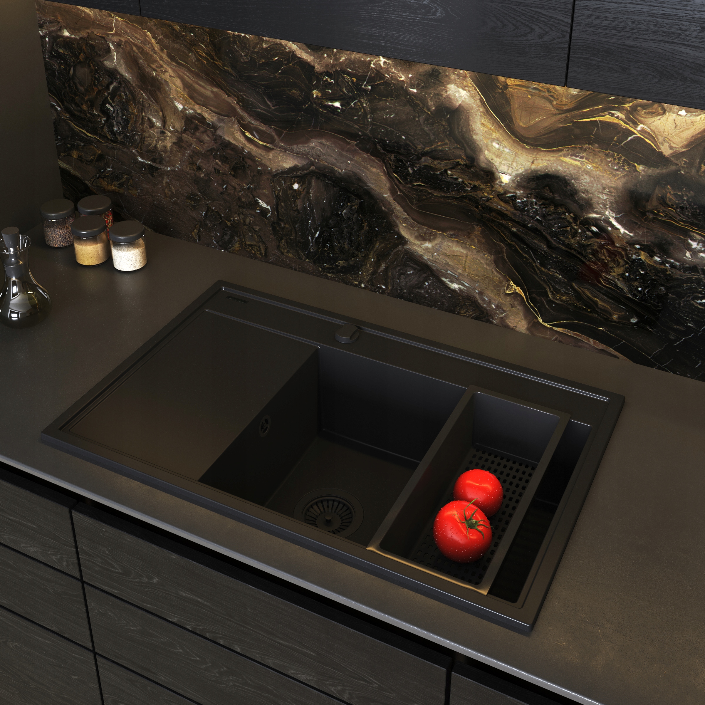 1 CHIUVETĂ DIN GRANIT CU O SINGURĂ CUVA ȘI SCURGĂTOR CAMEA 79×50VOLCANO (NEGRU MAT) CUVA STÂNGĂ