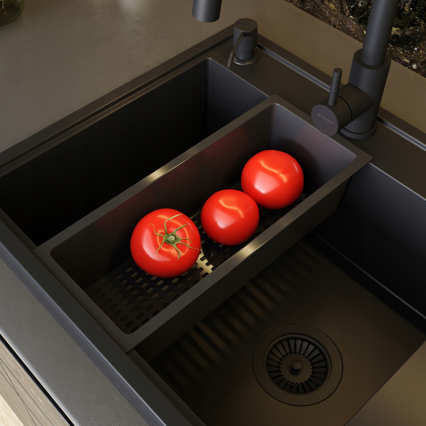 Având dimensiunile și forma, insertul BLACK EDITION se potrivește modelului Camea 79×50, iar culoarea sa este în armonie cu suprafața chiuvetei și cu alte accesoriide bucătărie din această serie.