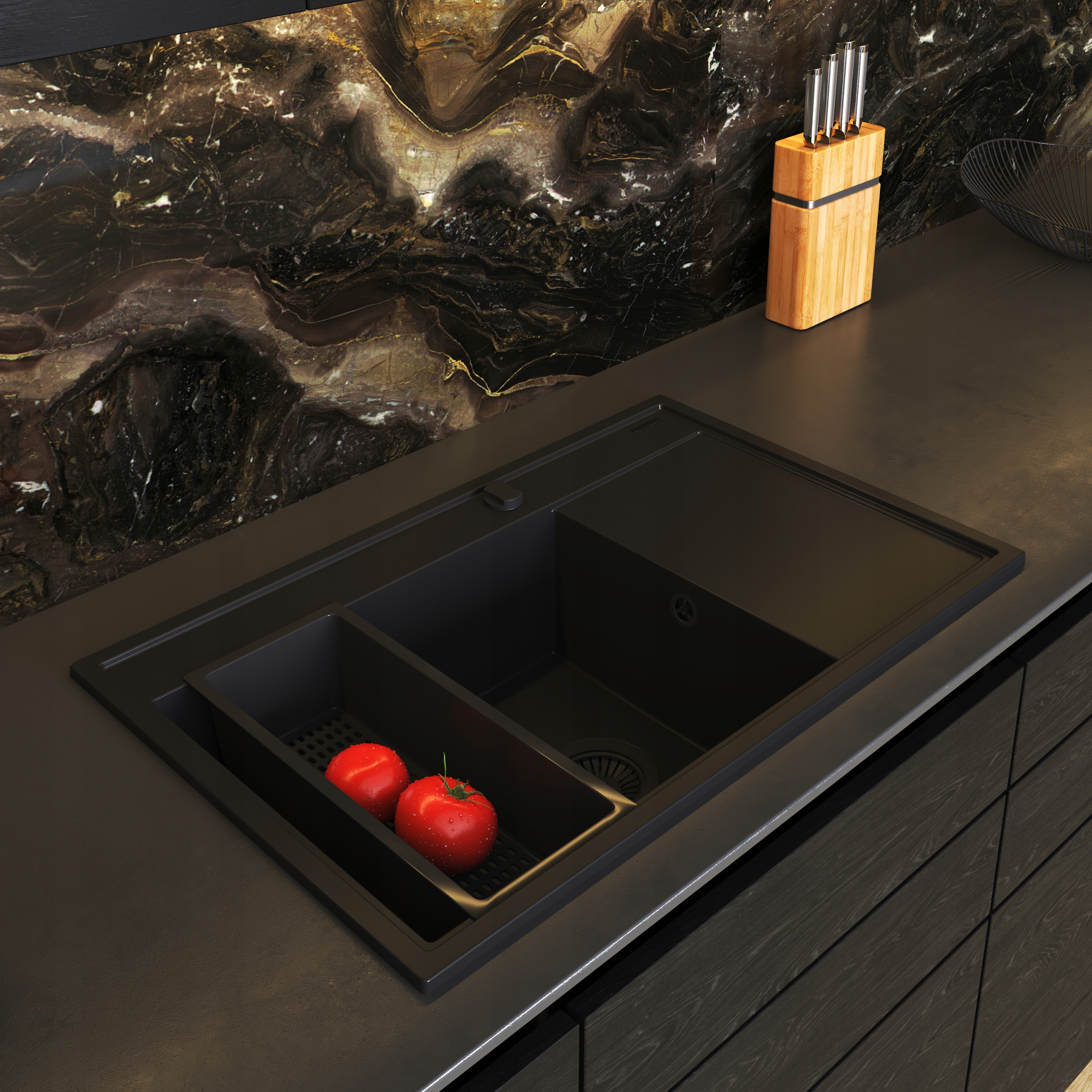 1 CHIUVETĂ DE GRANIT CU O SINGURĂ CUVĂ ȘI PICURĂTOR CAMEA 79×50 VOLCANO (NEGRU MAT) CUVĂ STÂNGA
