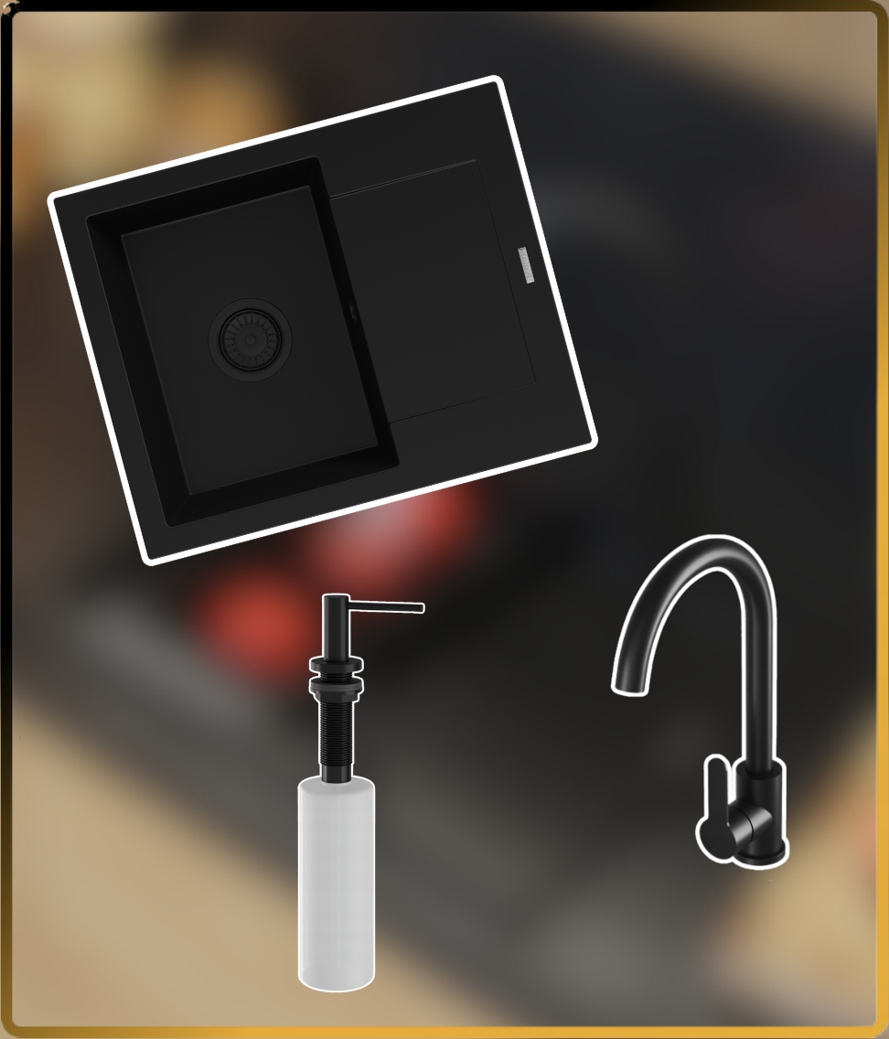 Setul Bello este complet: chiuvetă, sifon, baterie și dozator. Fără a fi nevoie de alte accesorii suplimentare.