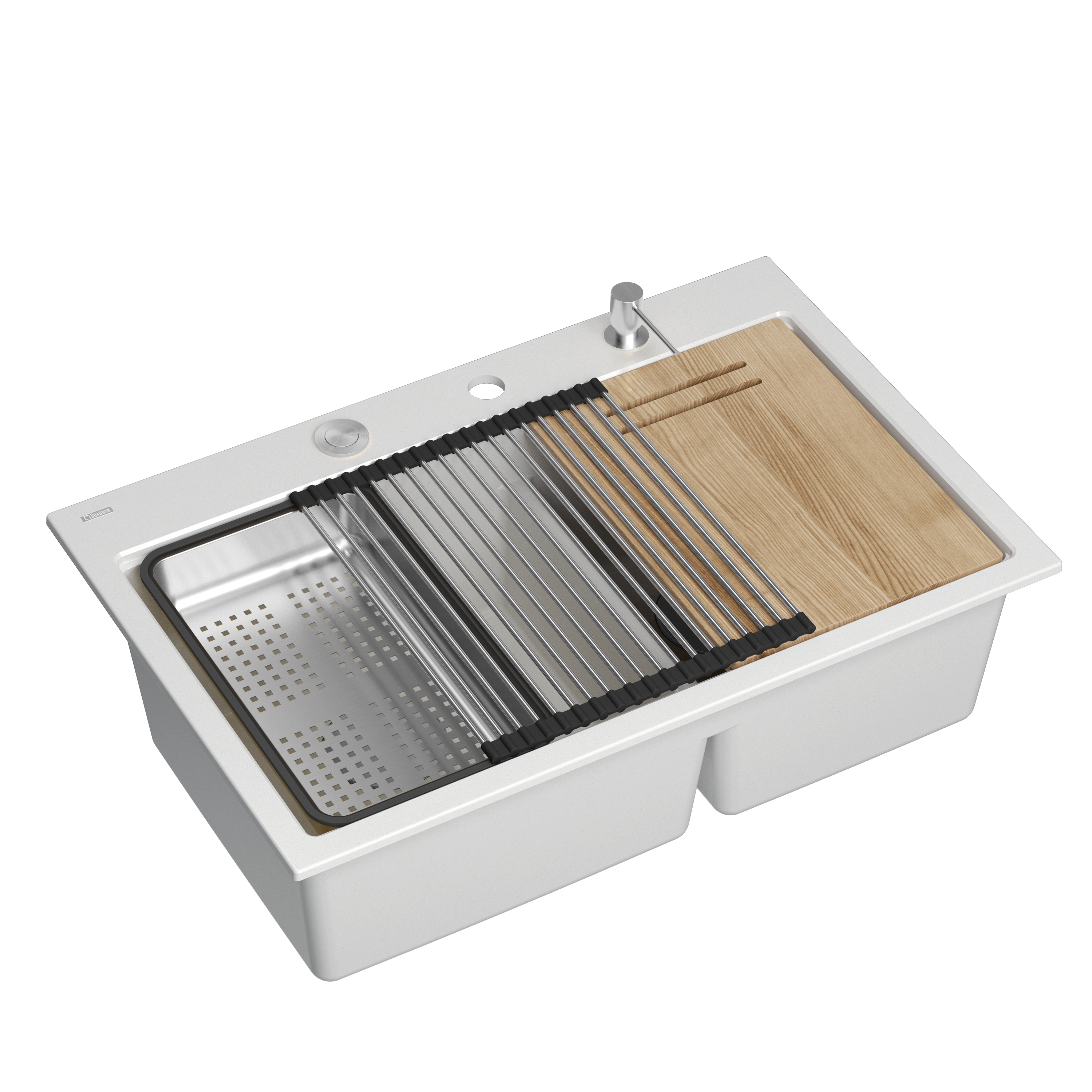 În varianta cu accesorii cu finisaj PVD, setul este completat cu o placă solidă și o inserție de scurgere, care extind semnificativ suprafața de lucru și sporesc confortul utilizării. Scurgerea automată Push-2-Open este un avantaj suplimentar, care permite golirea camerei fără a fi necesar să udați mâinile, sporind astfel confortul și igiena în utilizarea zilnică.