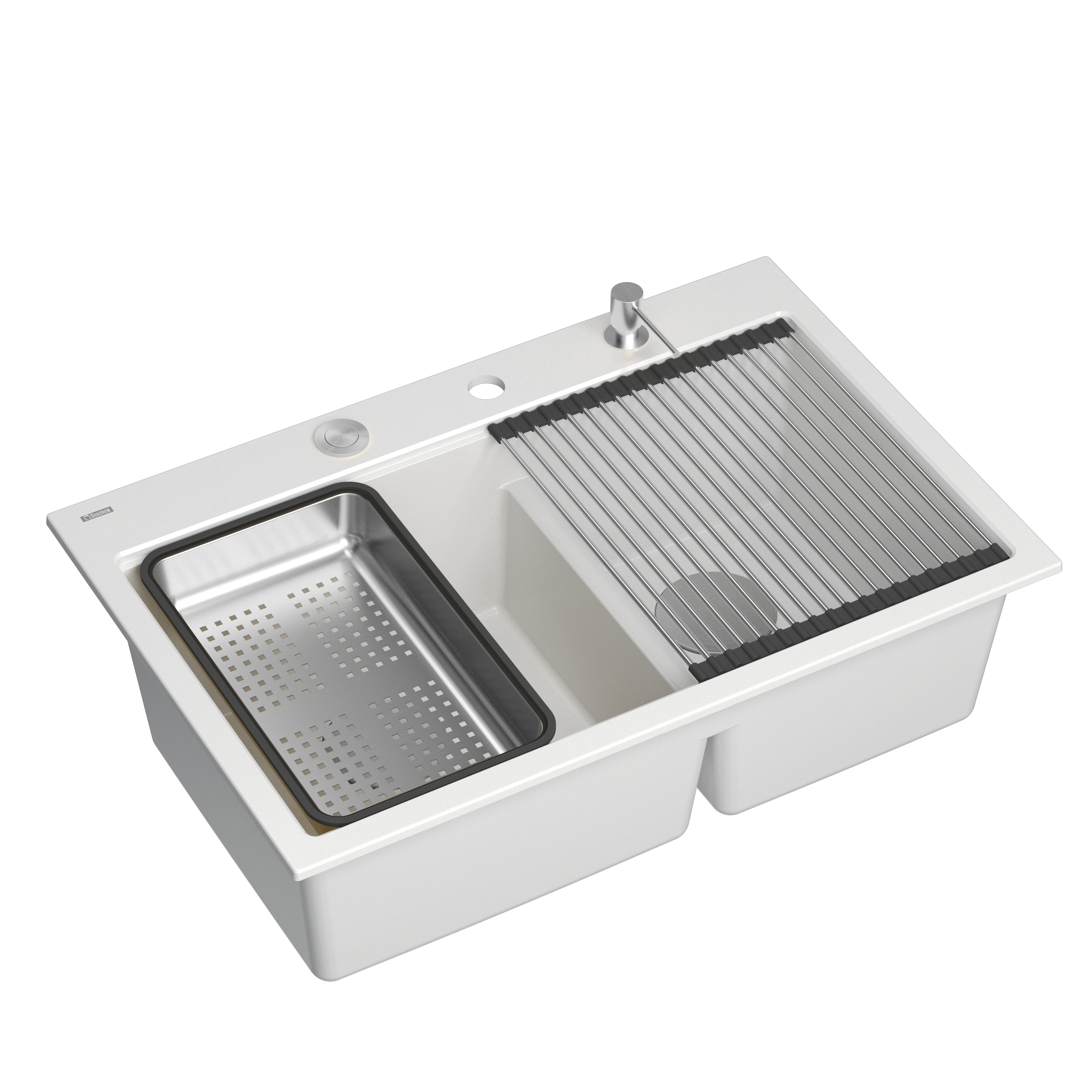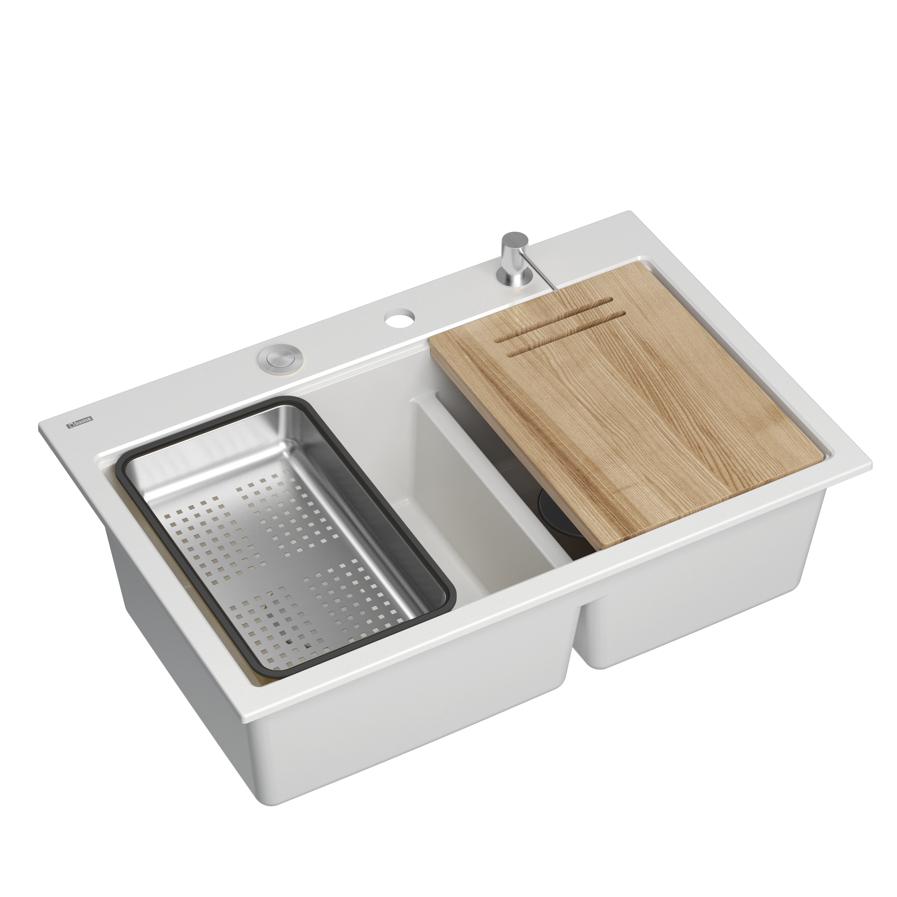 Datorită celor două camere spațioase, această chiuvetă permite realizarea simultană a diverselor activități, precum spălare, clătire sau înmuiere. Această soluție practică economisește timp și apă, sporind flexibilitatea în timpul activităților zilnice din bucătărie.