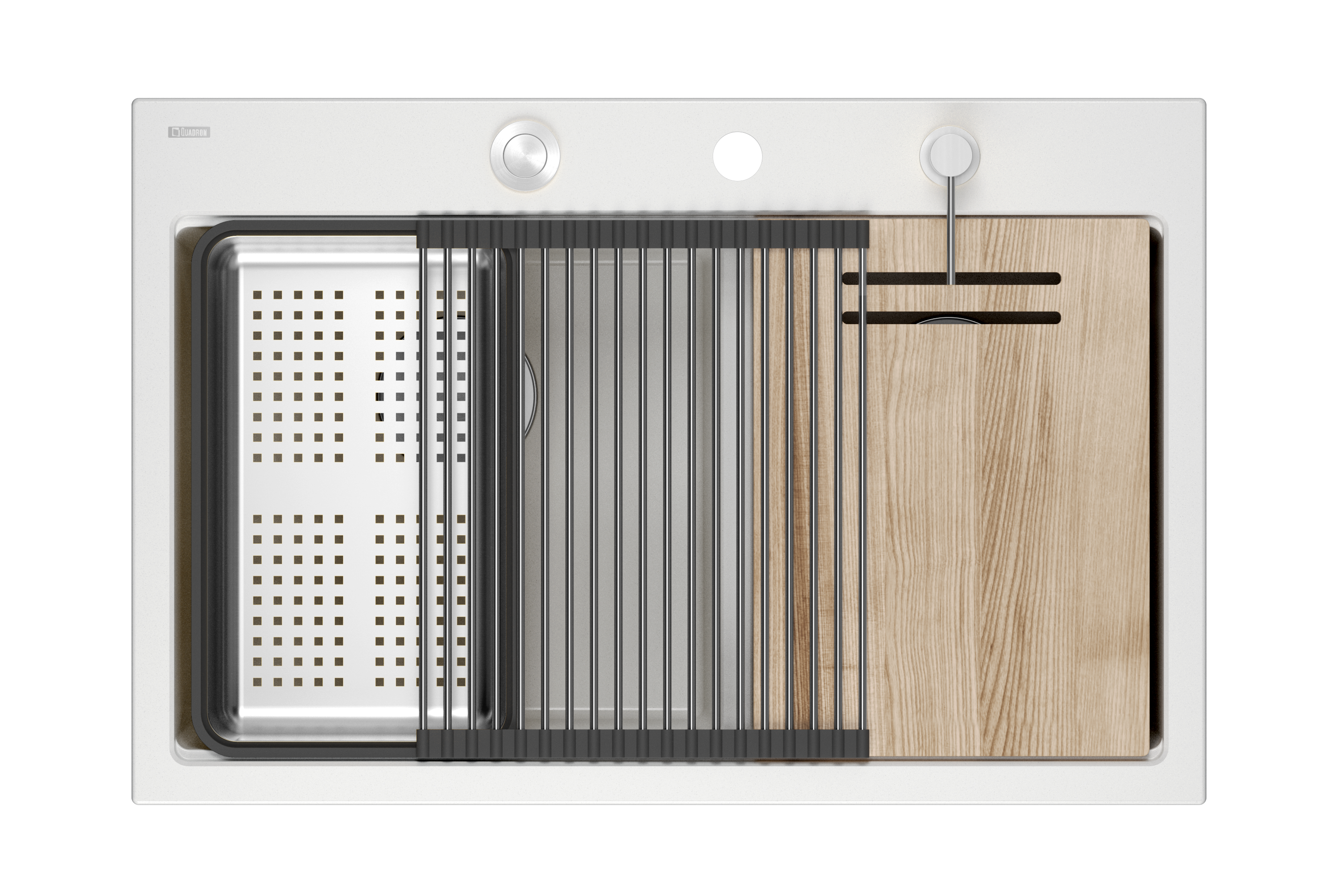 În varianta cu accesorii cu finisaj PVD, setul este completat cu o placă solidă și o inserție de scurgere, care extind semnificativ suprafața de lucru și sporesc confortul utilizării. Scurgerea automată Push-2-Open este un avantaj suplimentar, care permite golirea camerei fără a fi necesar să udați mâinile, sporind astfel confortul și igiena în utilizarea zilnică.