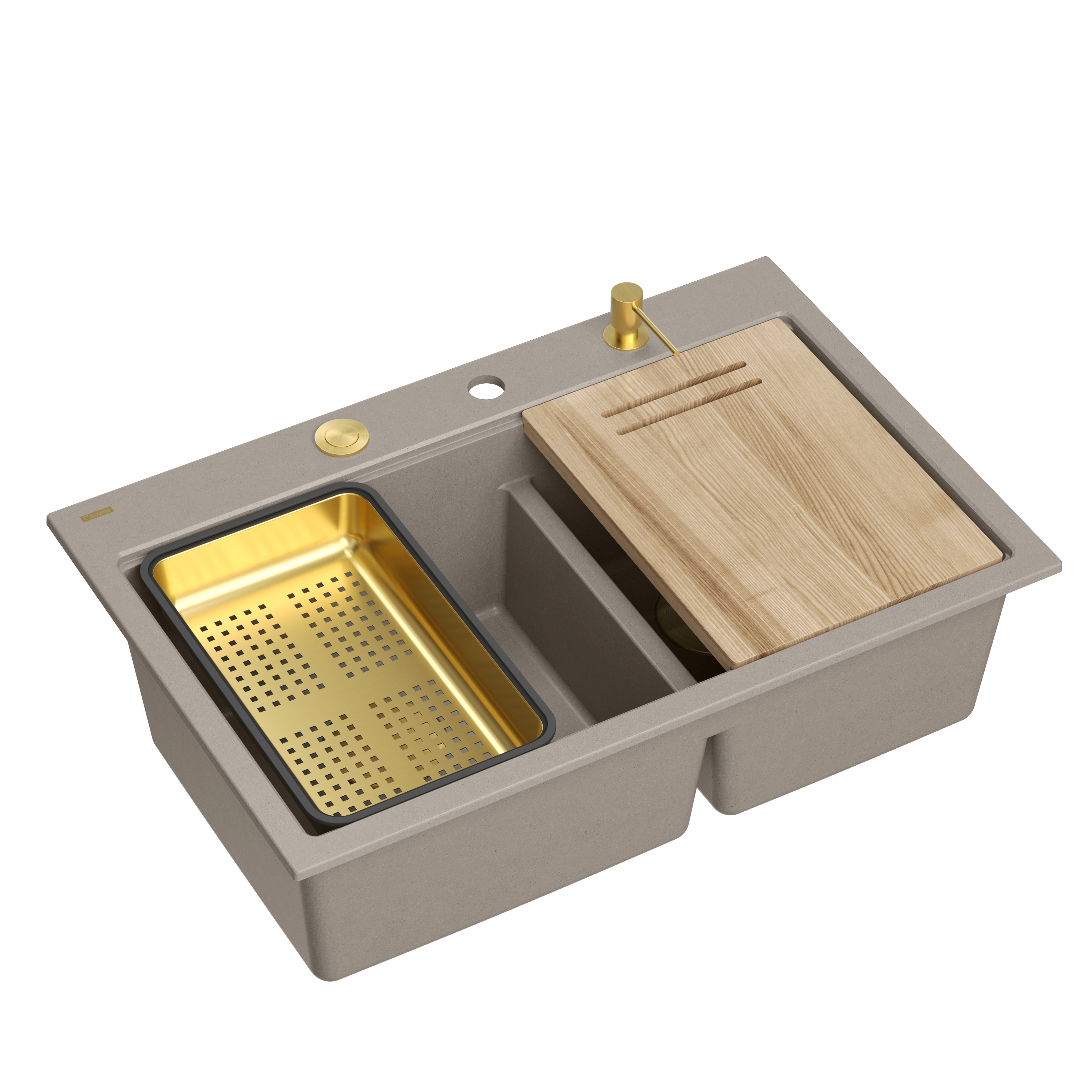În varianta cu robinete acoperite cu strat PVD, setul este îmbogățit cu o placă solidă și o tăviță de scurgere, care extind considerabil spațiul de lucru și sporesc confortul utilizării. Scurgerea automată Push-2-Open reprezintă un avantaj suplimentar, permițând golirea cuvei fără a fi nevoie să vă udați mâinile, sporind astfel confortul și igiena în timpul activităților zilnice.