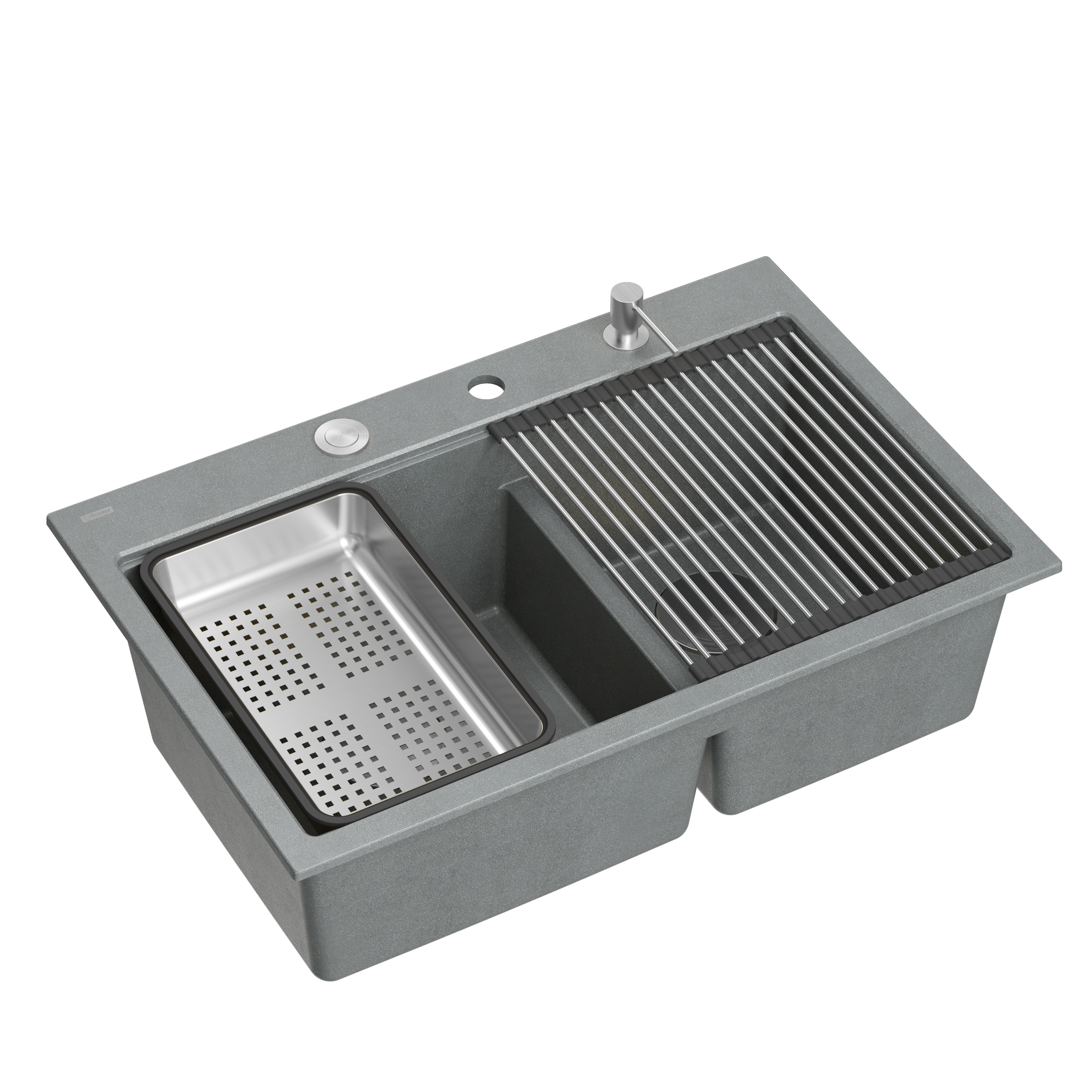 În varianta cu armătură cu strat PVD, setul este completat de o placă solidă și o inserție pentru uscător, care măresc semnificativ spațiul de lucru și îmbunătățesc confortul utilizării. Sifonul automat Push-2-Open reprezintă un avantaj suplimentar, permițând golirea cuvei fără a fi nevoie să vă udați mâinile, sporind astfel confortul și igiena în activitățile zilnice.