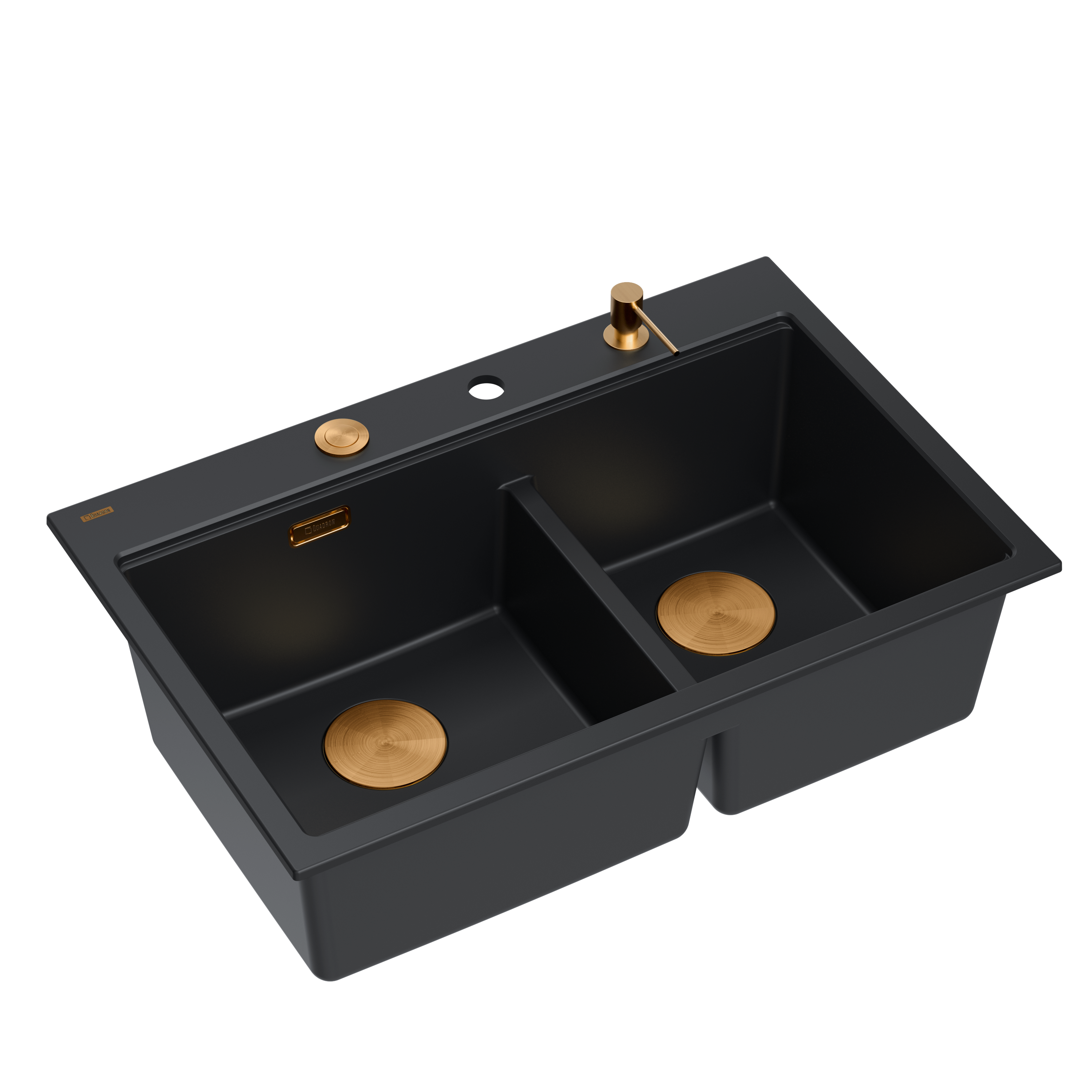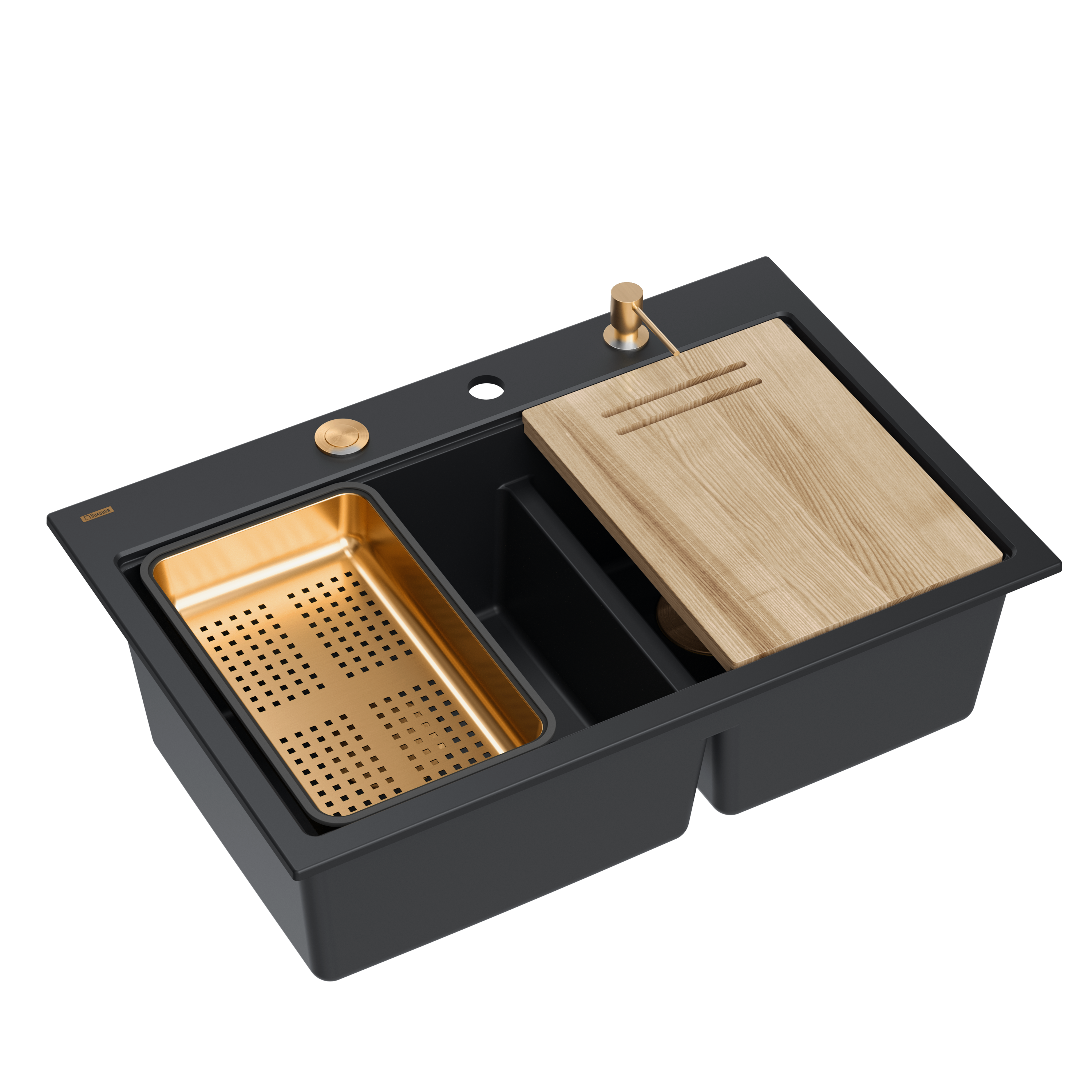 În versiunea cu accesorii în strat PVD, setul este completat de o placă solidă și o inserție pentru scurgere, care extind considerabil spațiul de lucru și îmbunătățesc confortul utilizării. Sistemul automat de drenaj Push-2-Open este un avantaj suplimentar, permițând golirea cuvei fără a-ți uda mâinile, sporind astfel confortul și igiena în activitățile zilnice.