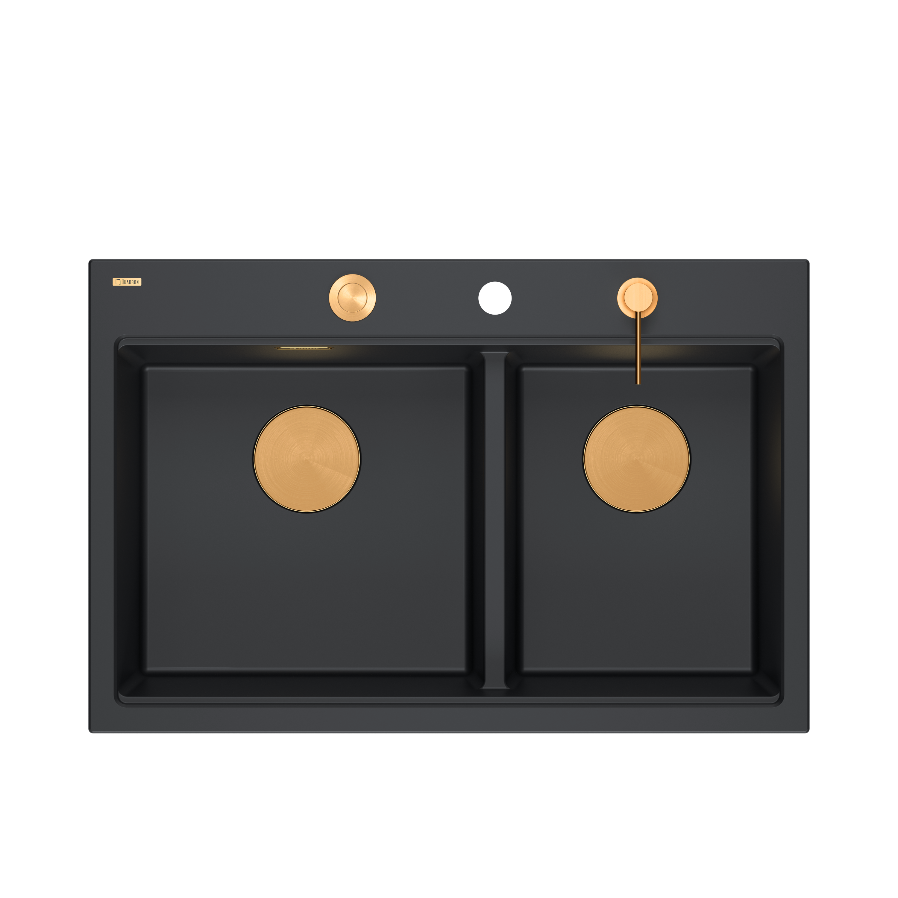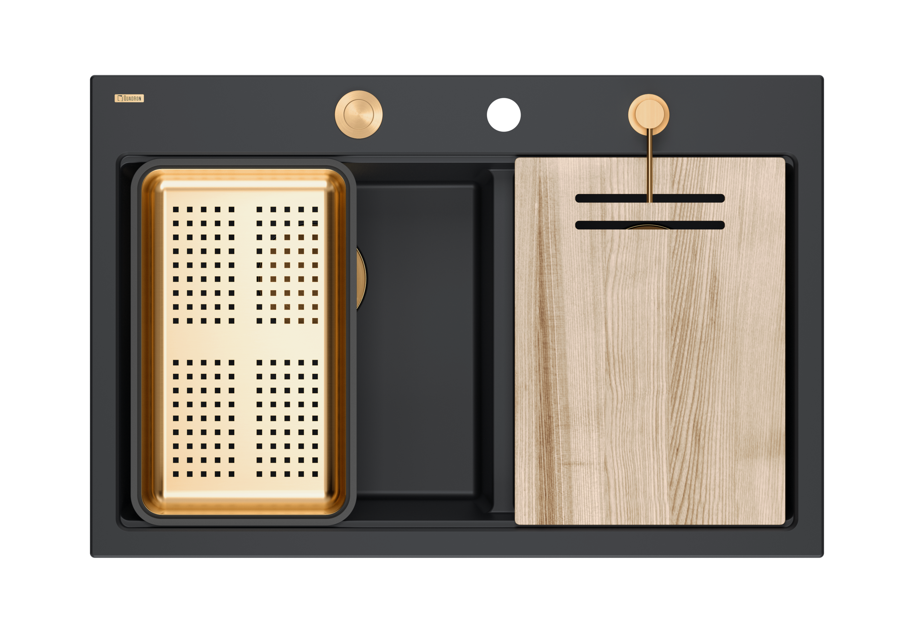 În versiunea cu accesorii în strat PVD, setul este completat de o placă solidă și o inserție pentru scurgere, care extind considerabil spațiul de lucru și îmbunătățesc confortul utilizării. Sistemul automat de drenaj Push-2-Open este un avantaj suplimentar, permițând golirea cuvei fără a-ți uda mâinile, sporind astfel confortul și igiena în activitățile zilnice.