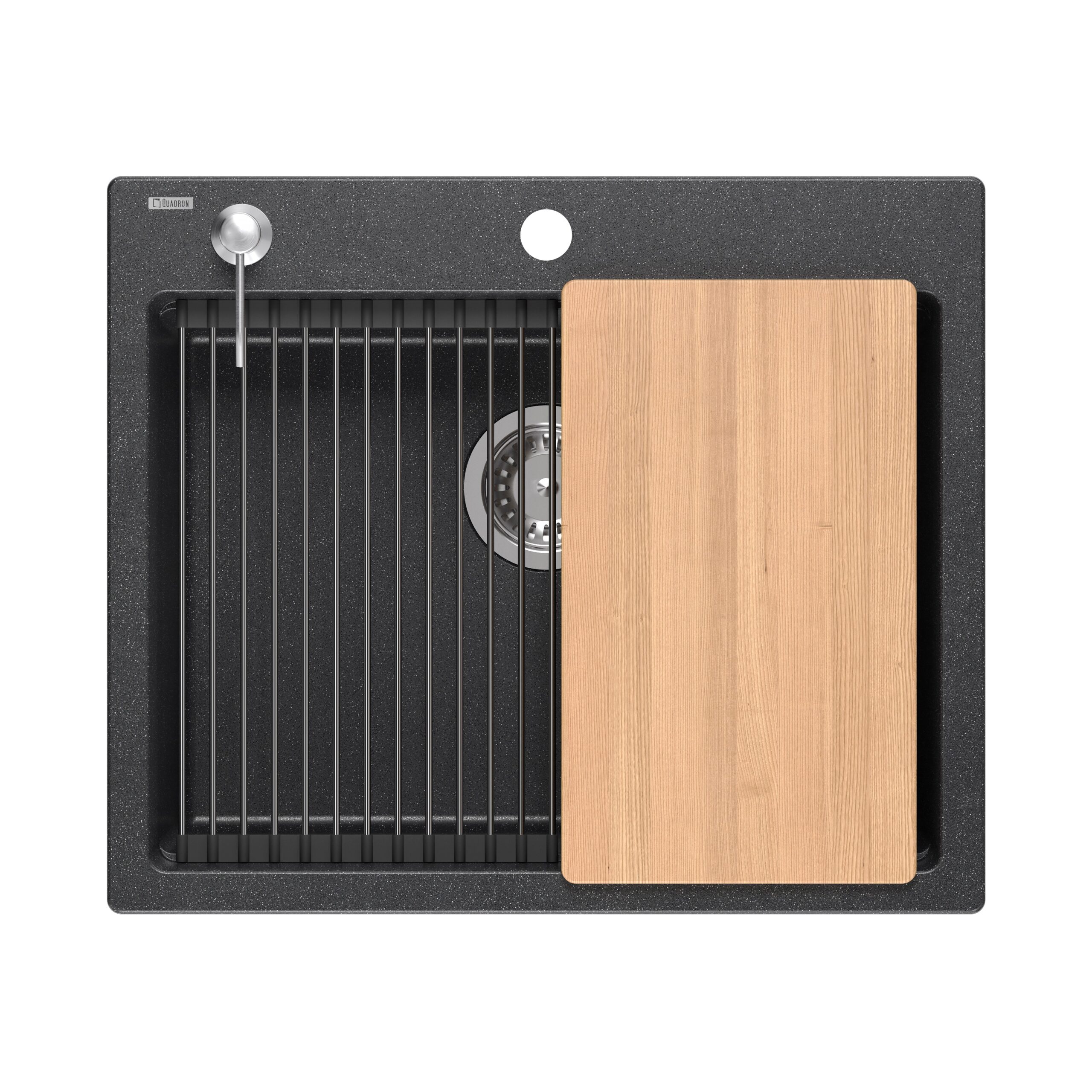 Materialul folosit, combinat cu un liant de înaltă calitate, creează o suprafață foarte netedă, care facilitează întreținerea curățeniei. Chiuveta este echipată standard cu un set mare de accesorii suplimentare, care ușurează semnificativ munca în jurul bazinului. Pe marginea superioară a fost montat un dozator de detergent, care oferă posibilitatea eliminării recipientelor suplimentare pentru detergenți, iar lichidul nu se varsă dincolo de marginile chiuvetei. În interiorul bazinului chiuvetei s-a aplicat o margine suplimentară, pe care se poate sprijini un covoraș Qmată pliabil și o inserție de scurgere din oțel. Tocătorul își are locul deasupra bazinului. Utilizarea acestor elemente extinde suprafața de lucru în bucătărie și permite utilizarea bazinului ca spațiu de lucru suplimentar, pentru tăiere sau uscare.