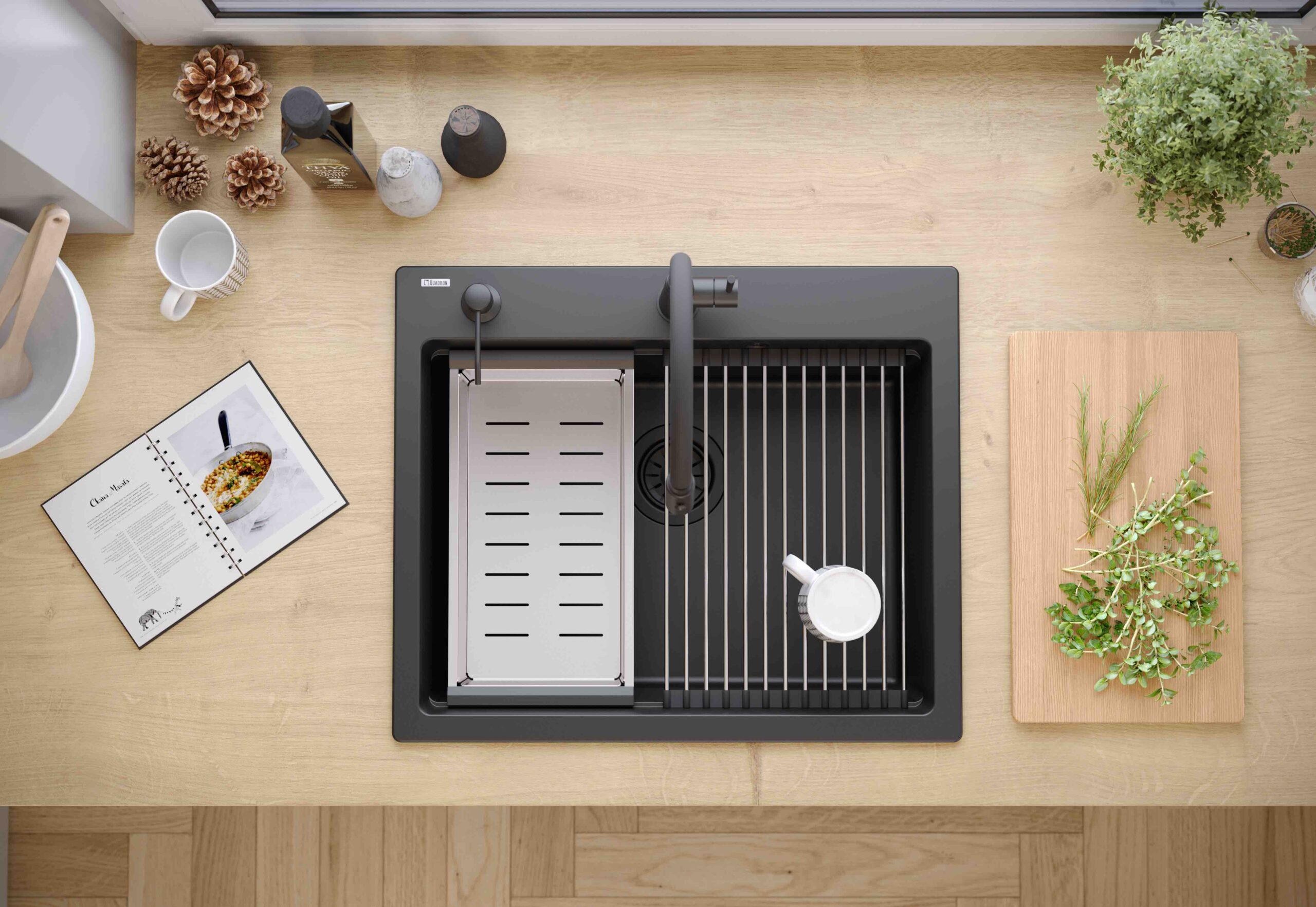 Materialul folosit, combinat cu un liant de înaltă calitate, creează o suprafață foarte netedă, care facilitează întreținerea curățeniei. Chiuveta este echipată standard cu un set mare de accesorii suplimentare, care ușurează semnificativ munca în jurul bazinului. Pe marginea superioară a fost montat un dozator de detergent, care oferă posibilitatea eliminării recipientelor suplimentare pentru detergenți, iar lichidul nu se varsă dincolo de marginile chiuvetei. În interiorul bazinului chiuvetei s-a aplicat o margine suplimentară, pe care se poate sprijini un covoraș Qmată pliabil și o inserție de scurgere din oțel. Tocătorul își are locul deasupra bazinului. Utilizarea acestor elemente extinde suprafața de lucru în bucătărie și permite utilizarea bazinului ca spațiu de lucru suplimentar, pentru tăiere sau uscare.