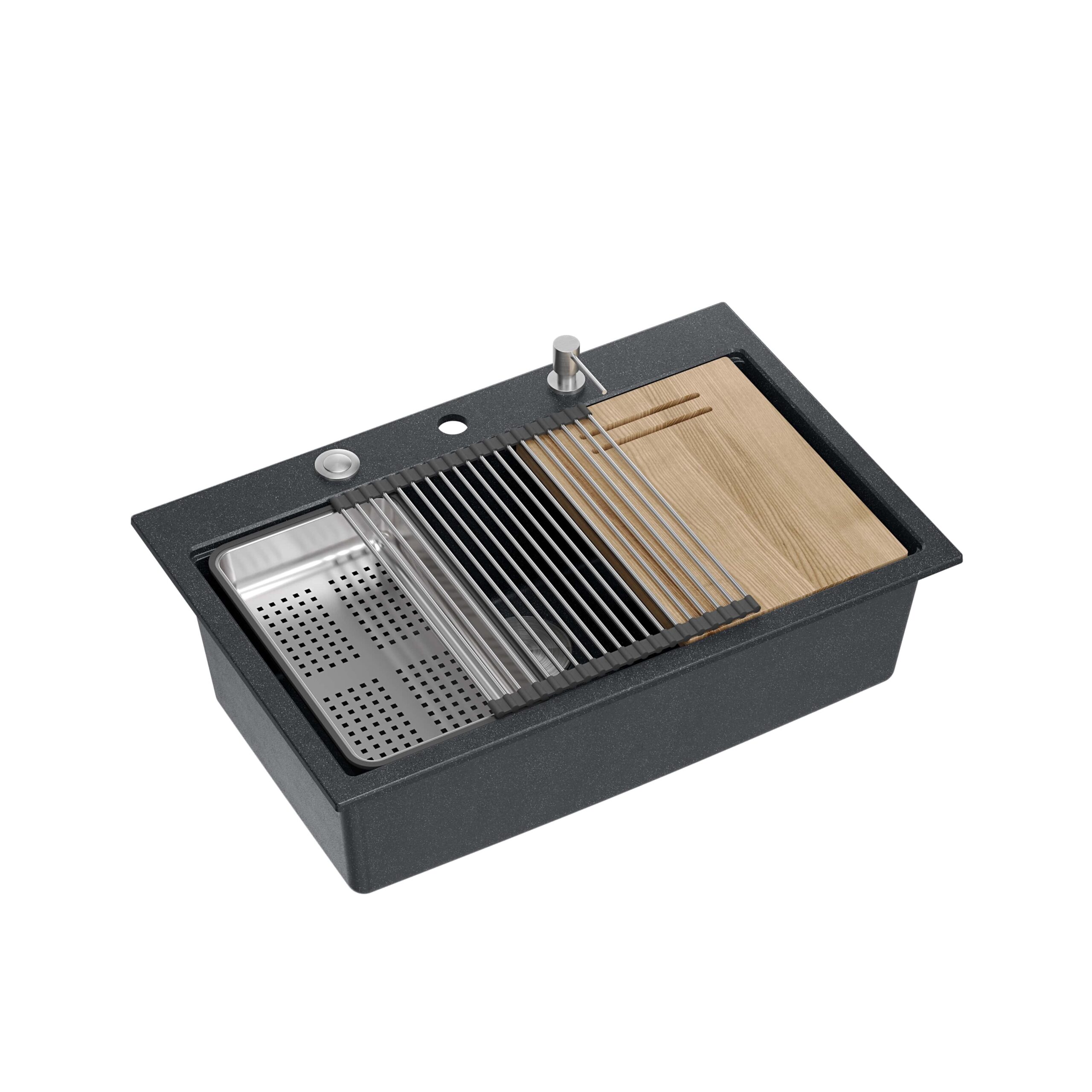 Marc Workstation GraniteQ – este o colecție dedicată utilizatorilor care doresc funcționalitate extinsă la chiuvetă. În cazul acestui model, datorită utilizării unei cuve foarte mari, de 61 de litri, putem spăla și clăti confortabil chiar și tăvile mari de cuptor!
