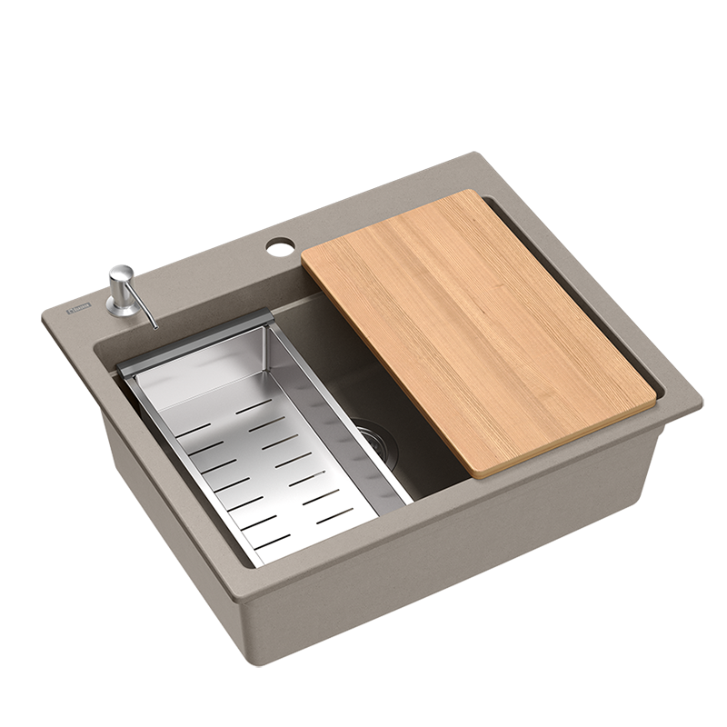 Materialul utilizat, combinat cu un liant de înaltă calitate, creează o suprafață foarte netedă, care facilitează menținerea curățeniei. Chiuveta este echipată standard cu un set mare de accesorii suplimentare, care simplifică semnificativ activitățile din jurul cuvei. Pe margine este montat un dozator pentru detergent de vase, evitând astfel amplasarea altor recipiente pentru detergenți, iar detergentul nu se scurge în afara marginii chiuvetei. În interiorul cuvei, chiuveta este dotată cu un suport suplimentar, care oferă sprijin pentru covorul Q pliabil și grătarul de scurgere din oțel. Tăblița își are locul pe partea superioară a cuvei. Utilizarea acestor elemente extinde suprafața de lucru în bucătărie și permite utilizarea eficientă a cuvei ca spațiu suplimentar pentru tăiere sau uscare.