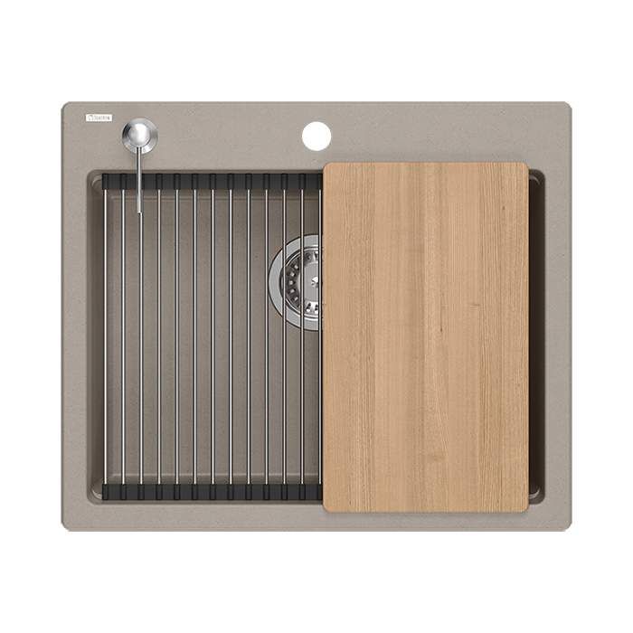 Materialul utilizat, combinat cu un liant de înaltă calitate, creează o suprafață foarte netedă, care facilitează menținerea curățeniei. Chiuveta este echipată standard cu un set mare de accesorii suplimentare, care simplifică semnificativ activitățile din jurul cuvei. Pe margine este montat un dozator pentru detergent de vase, evitând astfel amplasarea altor recipiente pentru detergenți, iar detergentul nu se scurge în afara marginii chiuvetei. În interiorul cuvei, chiuveta este dotată cu un suport suplimentar, care oferă sprijin pentru covorul Q pliabil și grătarul de scurgere din oțel. Tăblița își are locul pe partea superioară a cuvei. Utilizarea acestor elemente extinde suprafața de lucru în bucătărie și permite utilizarea eficientă a cuvei ca spațiu suplimentar pentru tăiere sau uscare.