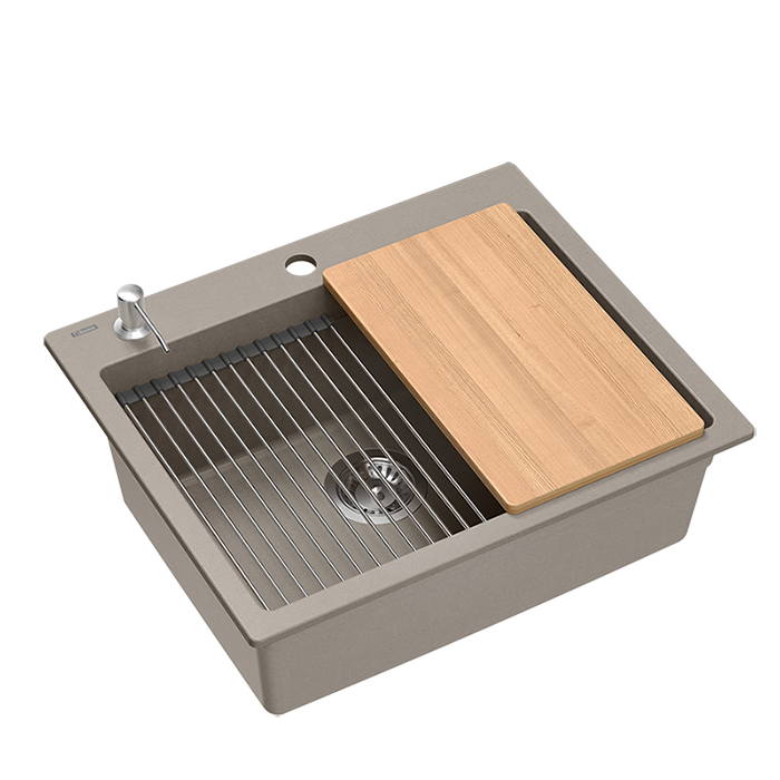 Chiuvetă granit Quadron Kurt 110 soft taupe, dispenser, tocător, covoraș Qmata, inserție de scurgere incluse