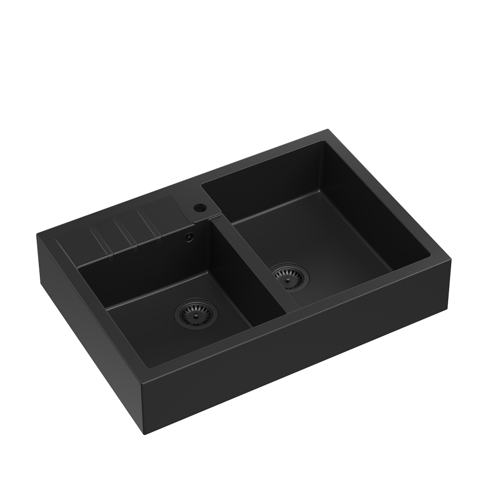 Chiuvetă dublă de tip farmhouse în culoarea negru mat este un tip de chiuvetă de bucătărie  care se remarcă prin designul său rustic, caracteristic și culoarea sa profundă și frumoasă. Chiuveta este fabricată din granit durabil și rezistent la deteriorări, asigurându-i un aspect atractiv de-a lungul anilor.