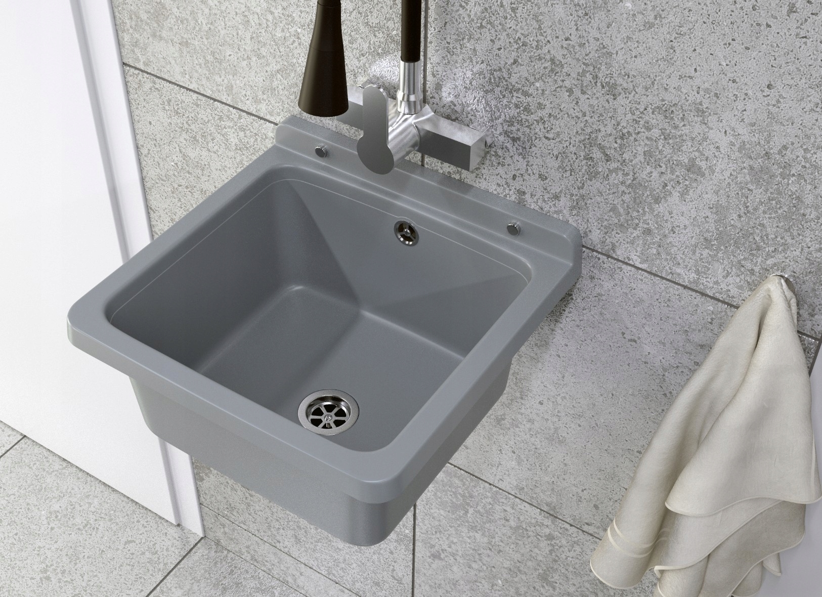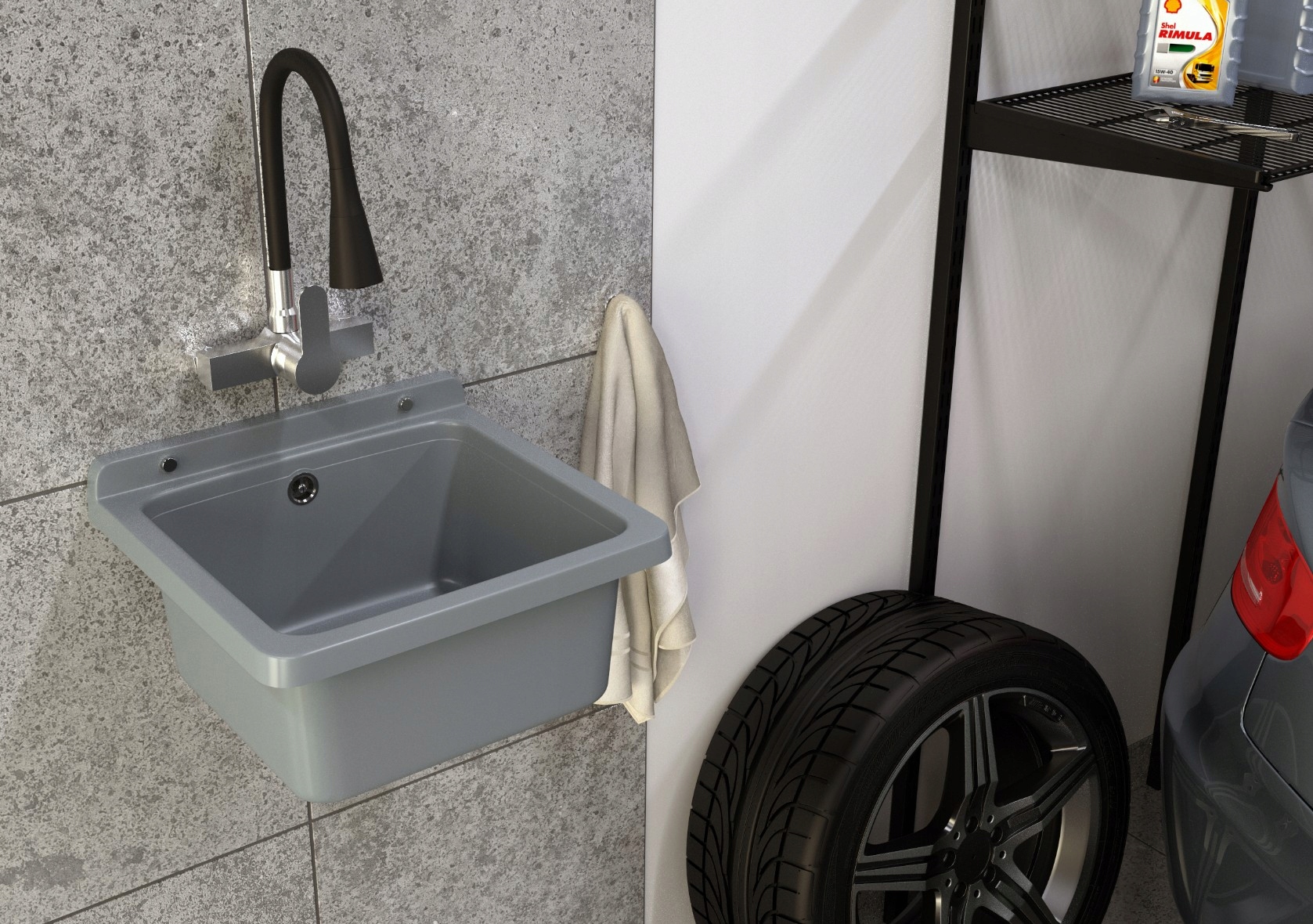 Chiuvetă gri gospodărească ORTA cu cuvă tehnică pentru garaj sau centrală.