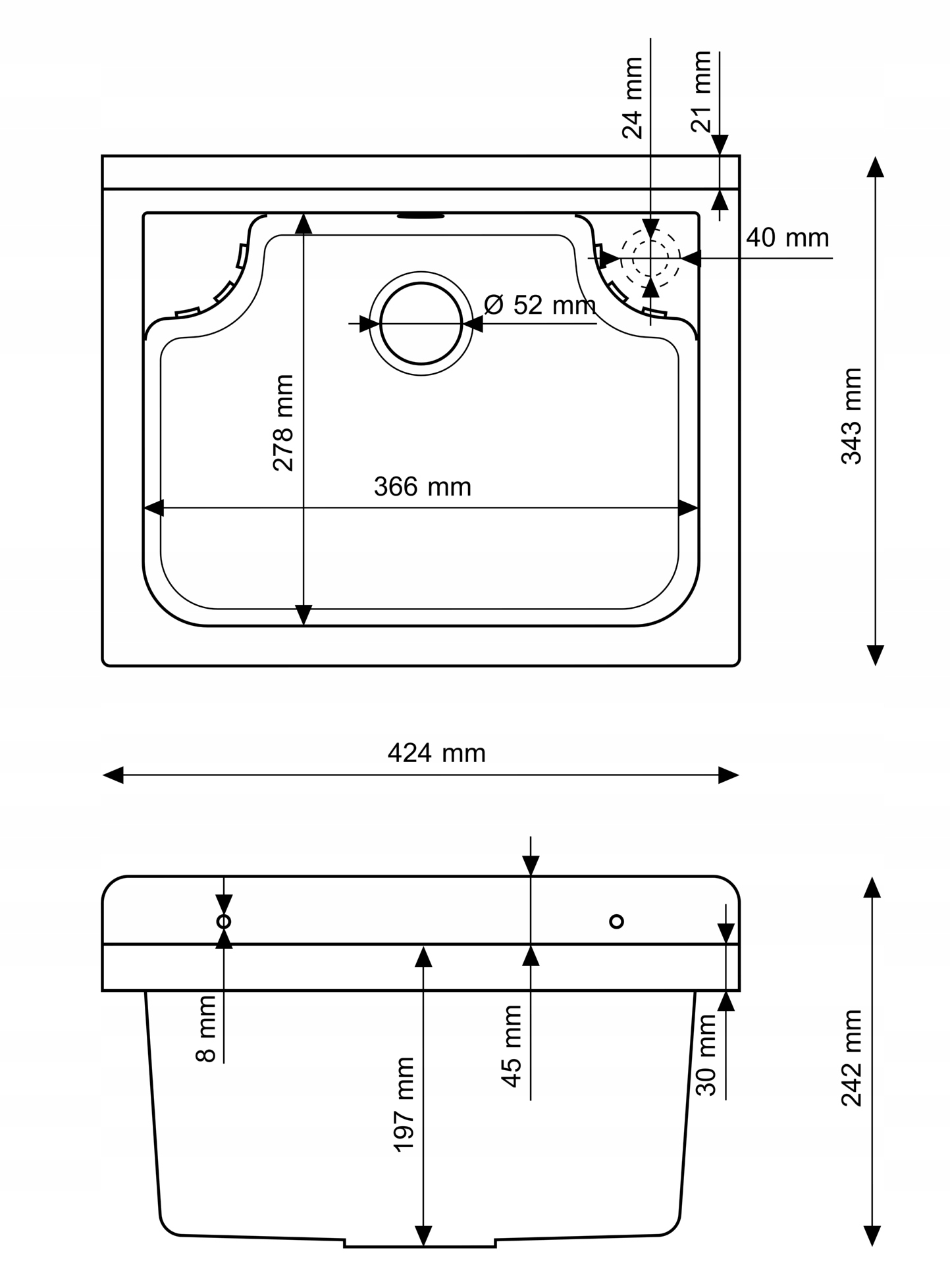 Chiuveta este fabricată din polipropilenă, care se caracterizează prin o rezistență ridicată la diverse tipuri de compuși și substanțe chimice. În special, prezintă o mare neutralitate la acțiunea solvenților, bazelor sau acizilor. În plus, materialul nu absoarbe apa.