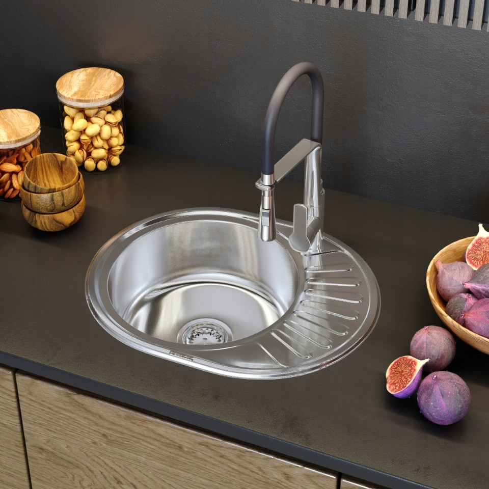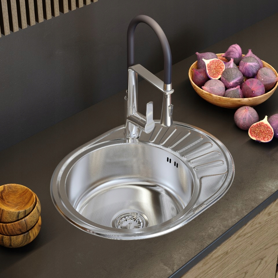 Chiuvetă rotundă cu o singură cameră și scurgător realizată din oțel inoxidabil funcțional și durabil. Modelul este fabricat în structura micro decor, care se caracterizează printr-o suprafață interesantă (structură convexă de tip plasă), precum și prin rezistență crescută la zgârieturi.