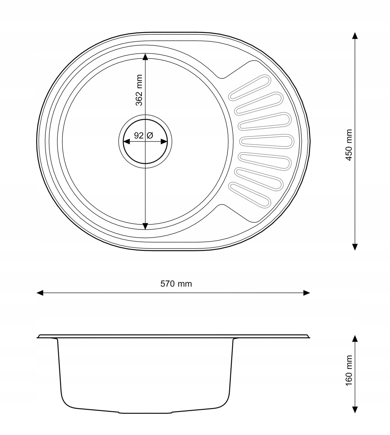 Diametrul orificiului de scurgere: 92 mm