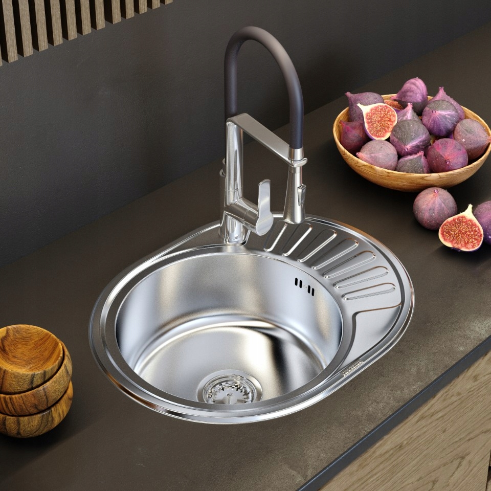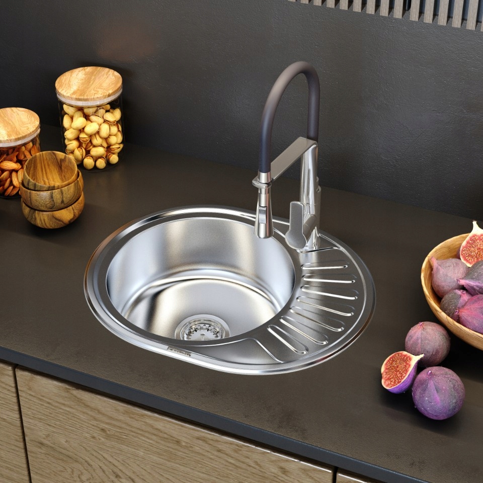 Chiuvetă rotundă cu o singură cuvă și scurgător realizată din oțel inoxidabil funcțional și durabil. Modelul este produs cu o suprafață netedă, satinată.