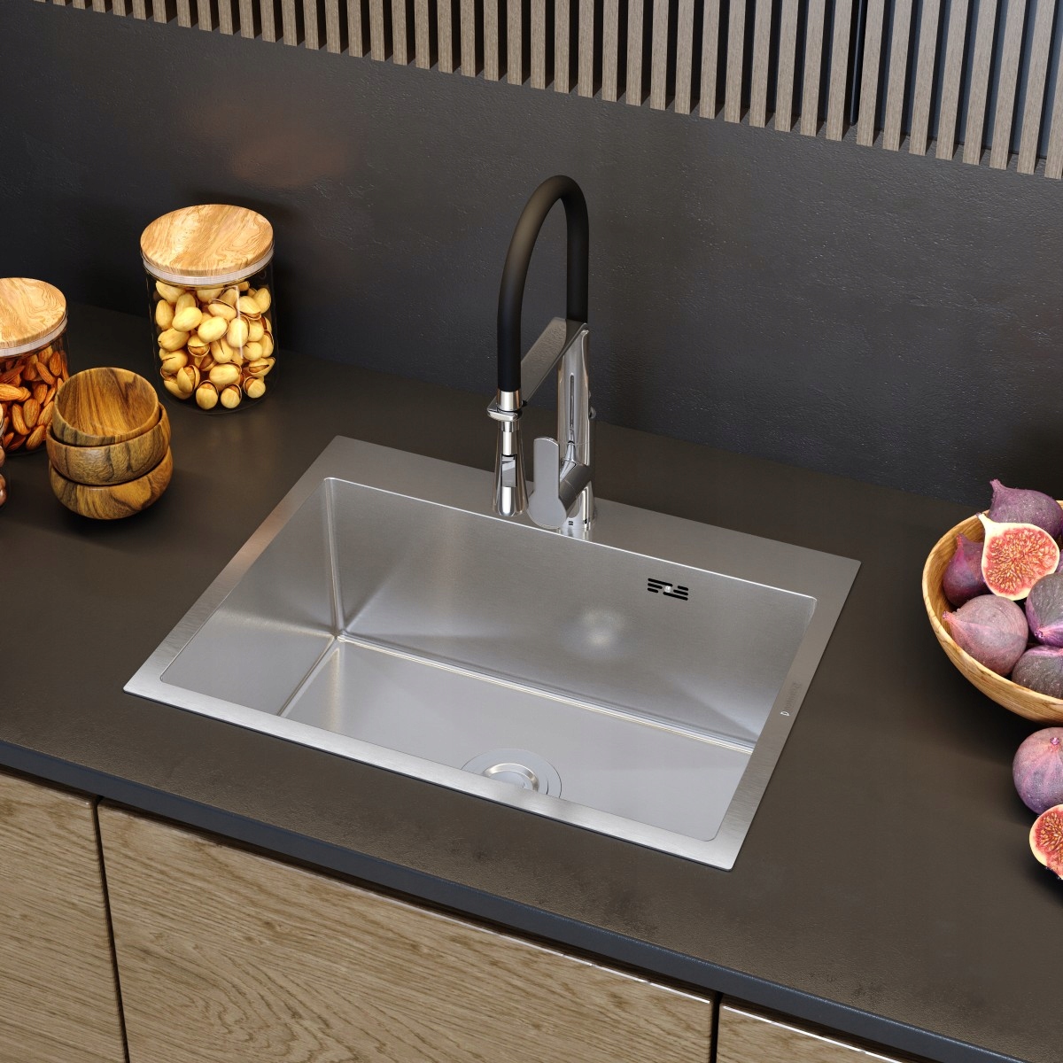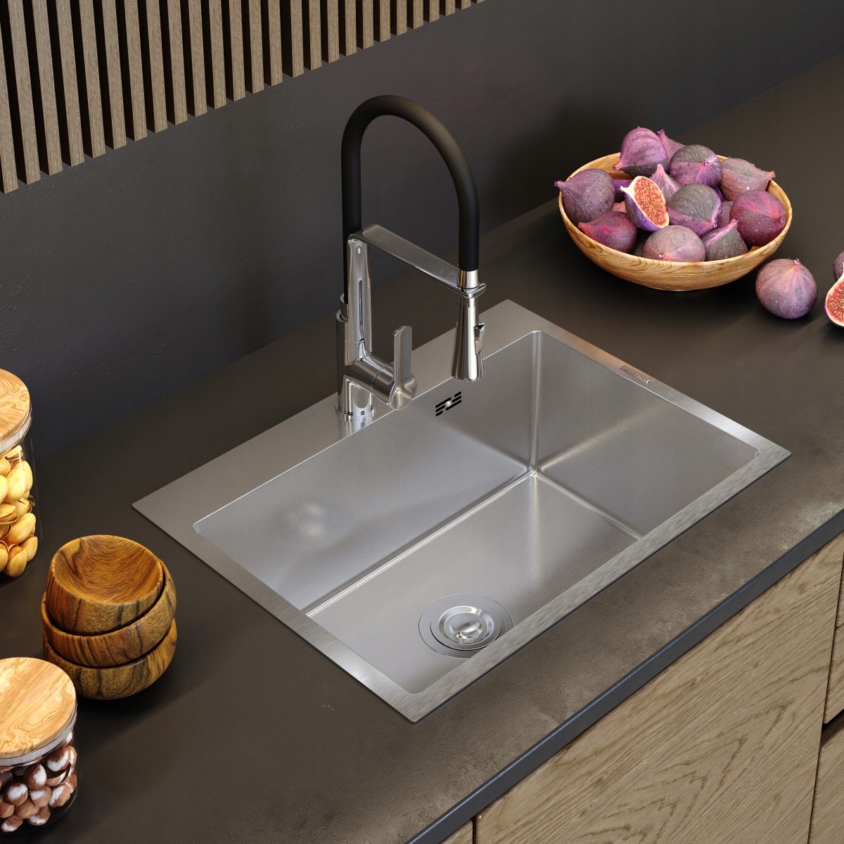 Chiuvetă din oțel cu o singură cameră destinată montării deasupra blatului. Chiuveta dispune de un orificiu (acoperit cu un capac estetic în culoarea chiuvetei) destinat pentru bateria de bucătărie.
