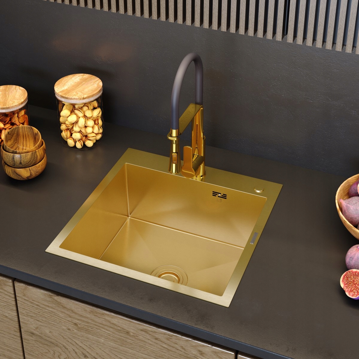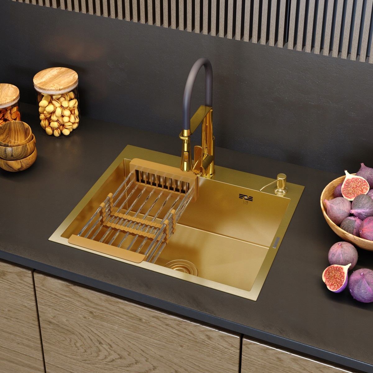 Chiuvetă de bucătărie din oțel inoxidabil cu o cuvă, auriu, coș, scurgător, dozator BARI65