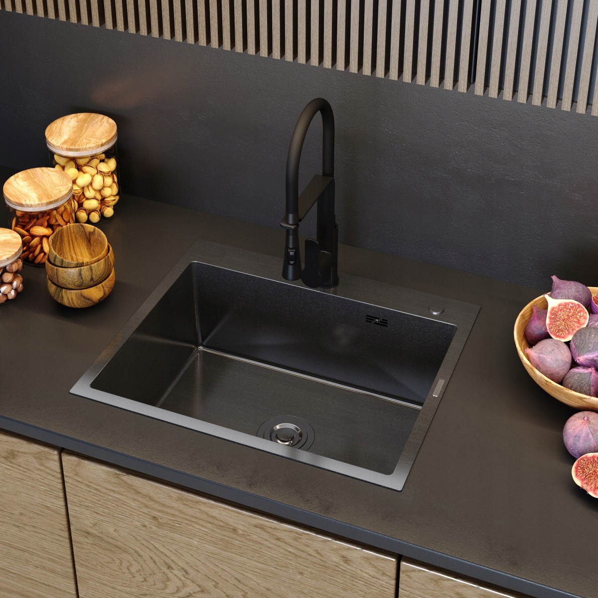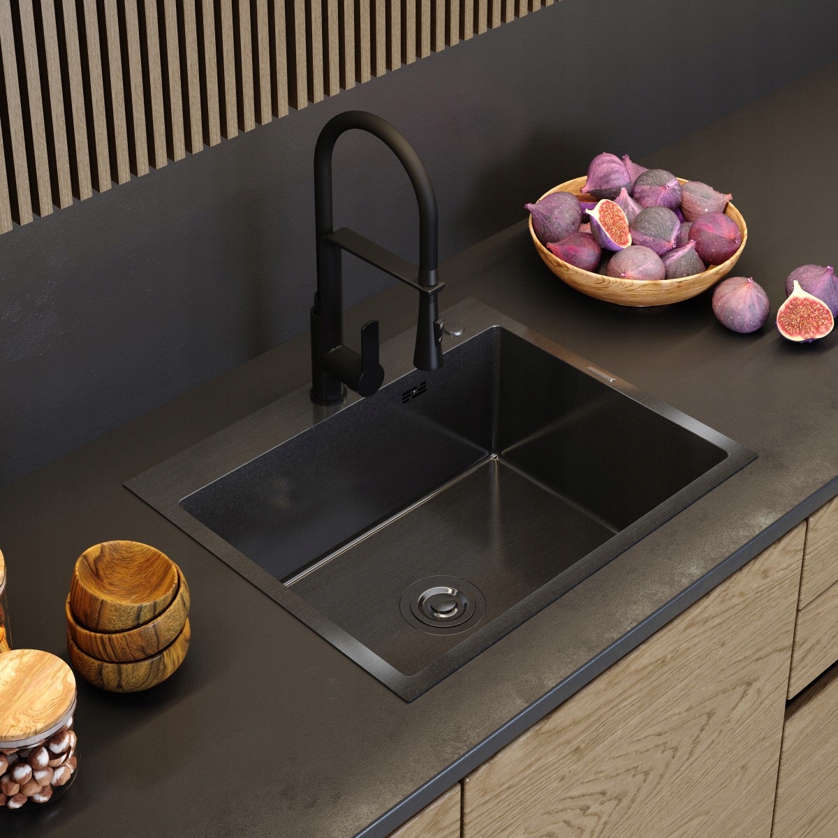 Chiuvetă din oțel inoxidabil cu o singură cuvă proiectată pentru montaj pe blat. Chiuveta are un singur orificiu (acoperit cu un capac estetic în culoarea chiuvetei) destinat pentru bateria de bucătărie.