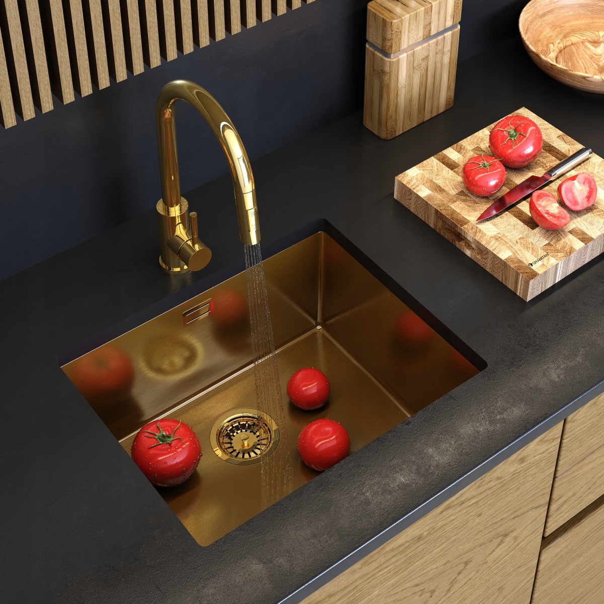 CHIUVETĂ DE BUCĂTĂRIE INCORPORABILĂ DIN OȚEL INOXIDABIL, O CUVA, AURIE, SILVO54, CU SIFON