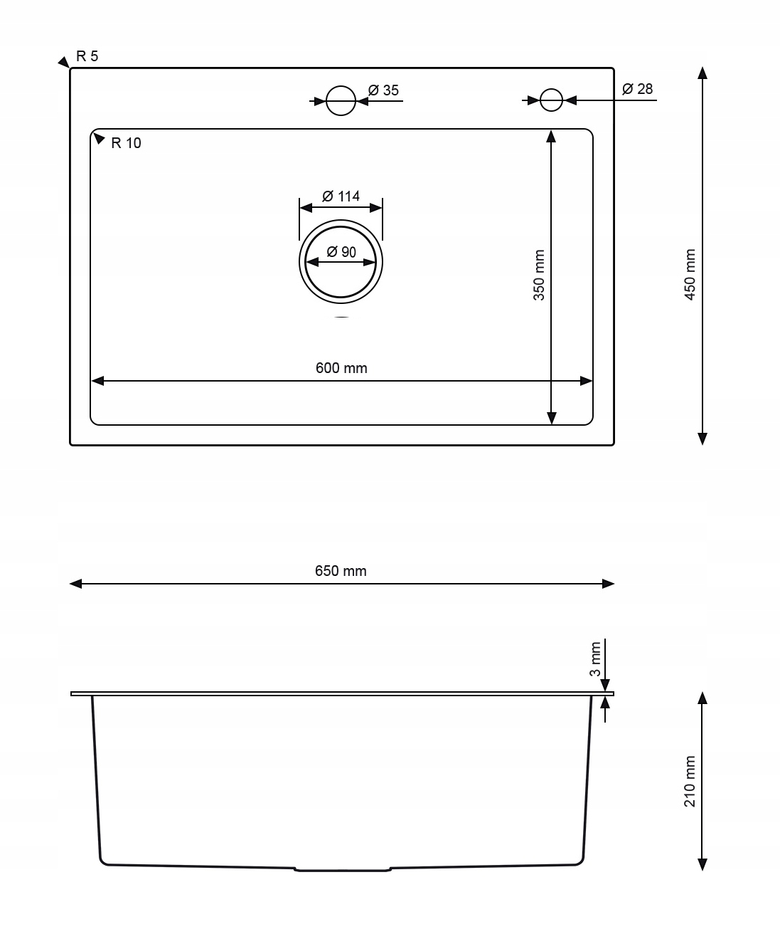 Chiuvetă din oțel inoxidabil cu o singură cameră concepută pentru montaj pe blat. Chiuveta are două orificii (acoperite cu un capac estetic în culoarea chiuvetei) destinate bateriei de bucătărie și dozatorului de lichid.