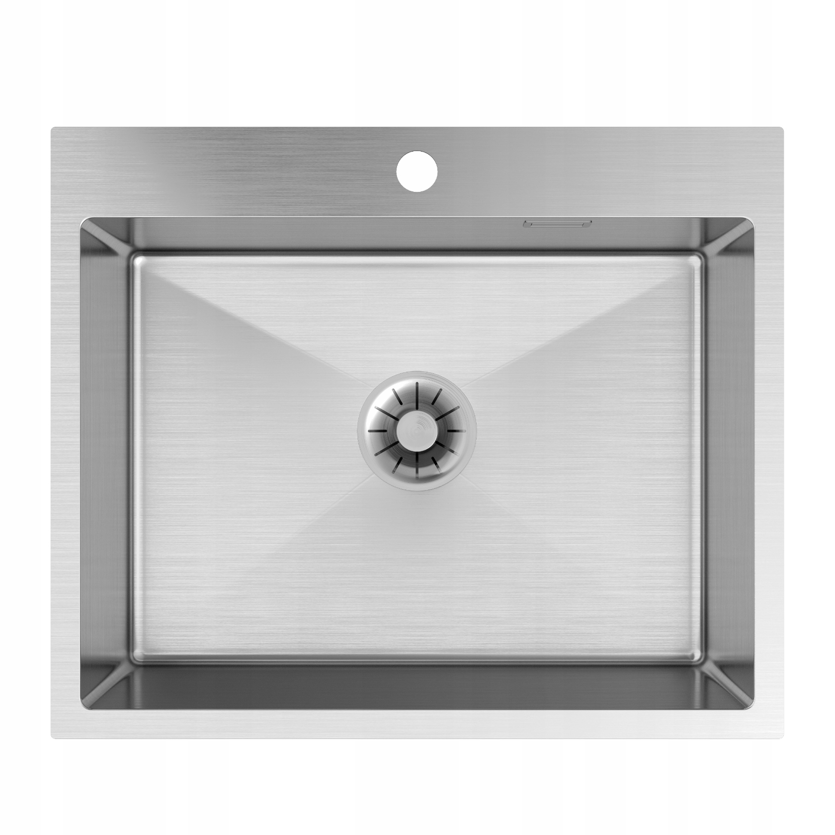 Chiuvetă din oțel inoxidabil cu o singură cuvă destinată montajului deasupra blatului. Chiuveta are un orificiu destinat bateriei de bucătărie.