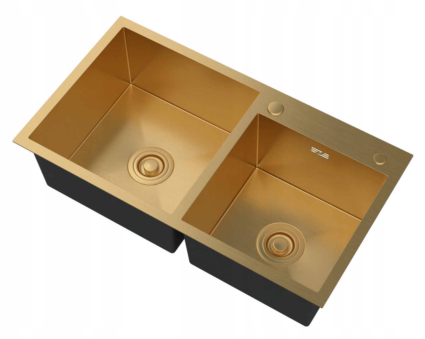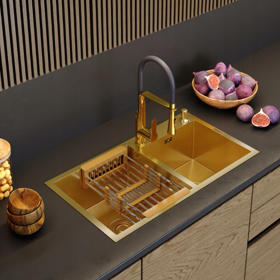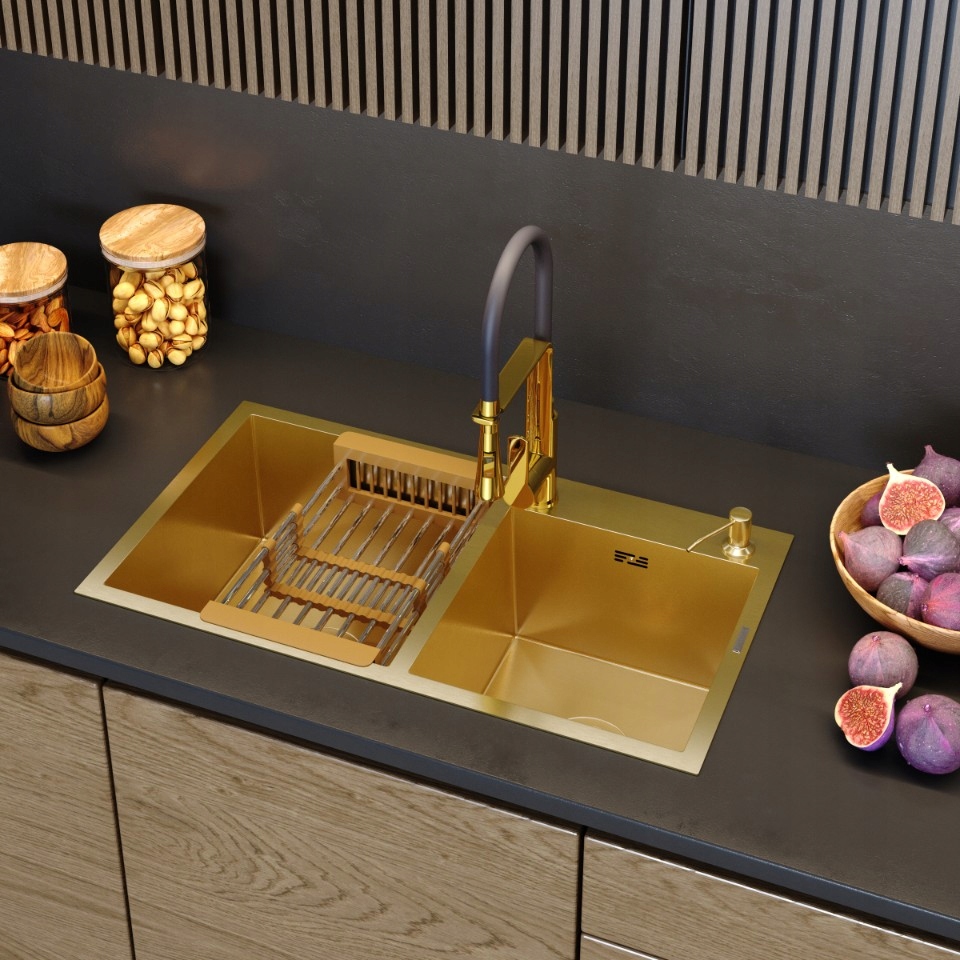 Chiuvetă din oțel inoxidabil 2 cuve auriu cu dozator scurgător sifon bari784