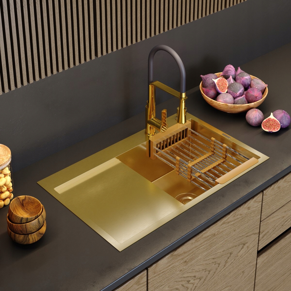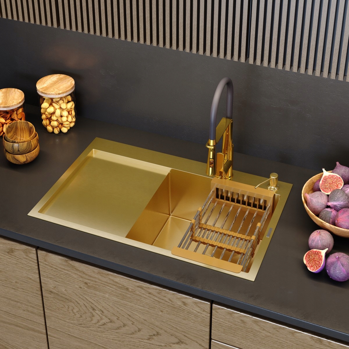 licitația include chiuveta cu sifon în culoarea auriu, picurătoare telescopică pentru chiuvetă și dozator de lichid; există posibilitatea achiziționării unei baterii la o altă licitație