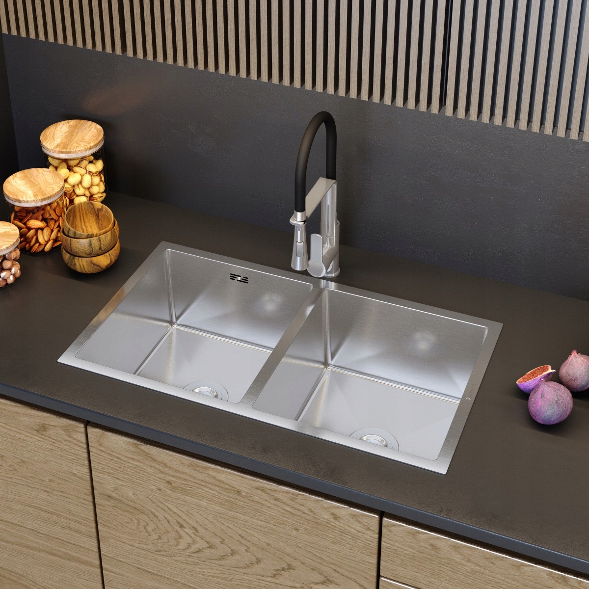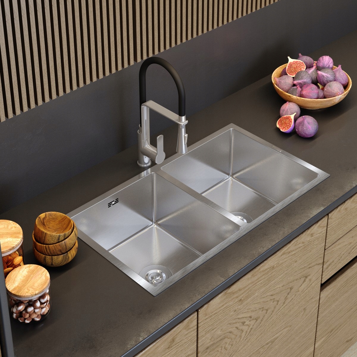 Chiuvetă dublă cu posibilitate de montaj alternativ – suspendată sau pe blat.