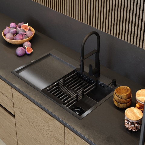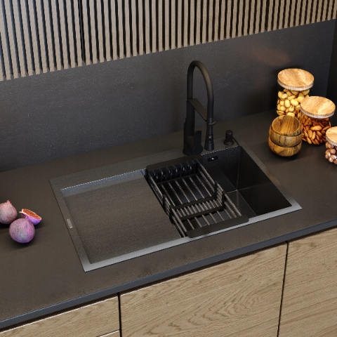 Chiuvetă cu o singură cupă și scurgător destinată montajului deasupra blatului. Chiuveta dispune de două orificii (acoperite cu un capac estetic în culoarea chiuvetei) destinate pentru baterie de bucătărie și dozator de lichid.