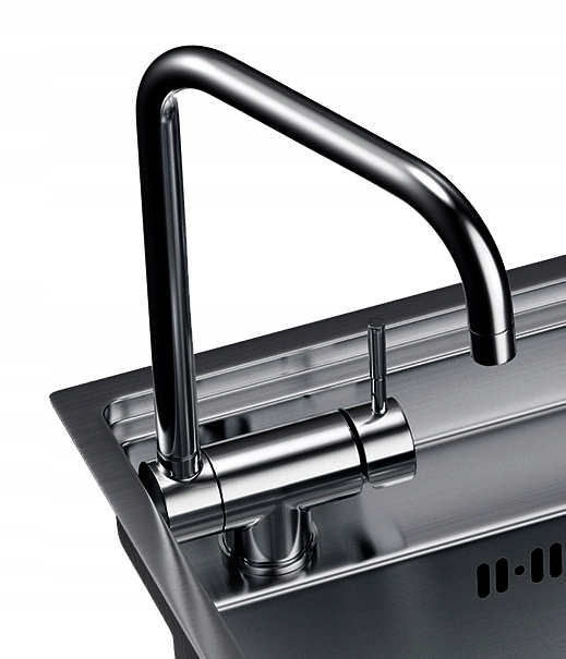 Chiuveta este echipată cu un robinet pliabil, un dozator pentru lichid și un sifon manual cu coș pentru resturi.